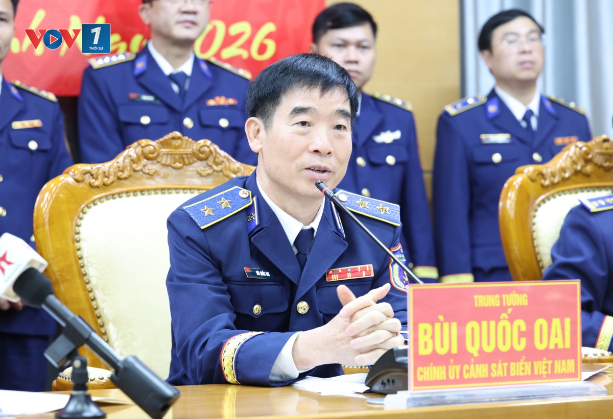Phát biểu động viên cán bộ, chiến sĩ, Trung tướng Bùi Quốc Oai – Chính ủy Cảnh sát biển ghi nhận tinh thần trách nhiệm, ý chí quyết tâm của lực lượng đang trực Tết nơi đầu sóng ngọn gió; đồng thời mong muốn mỗi cán bộ, chiến sĩ tiếp tục phát huy phẩm chất Bộ đội Cụ Hồ – Người chiến sĩ Cảnh sát biển, giữ vững bản lĩnh chính trị, đoàn kết, kỷ luật, nêu cao tinh thần cảnh giác, hoàn thành tốt nhiệm vụ, để Nhân dân cả nước đón Xuân an toàn, bình yên.