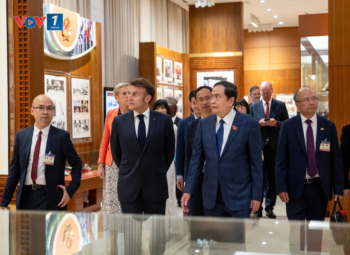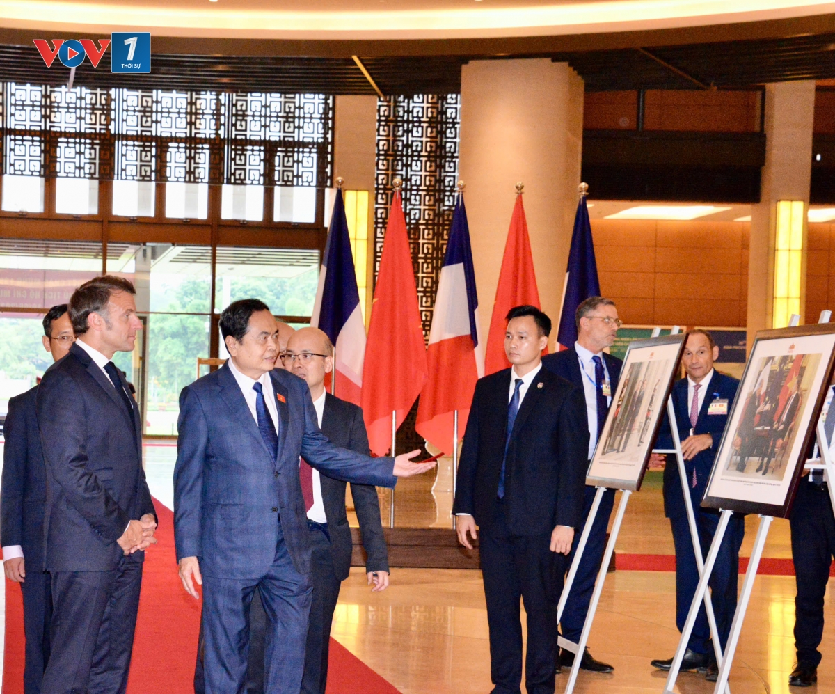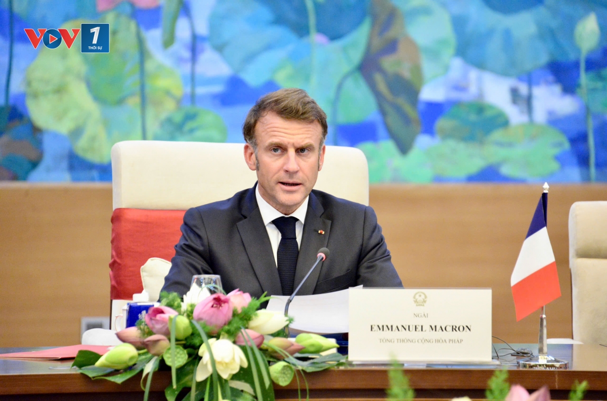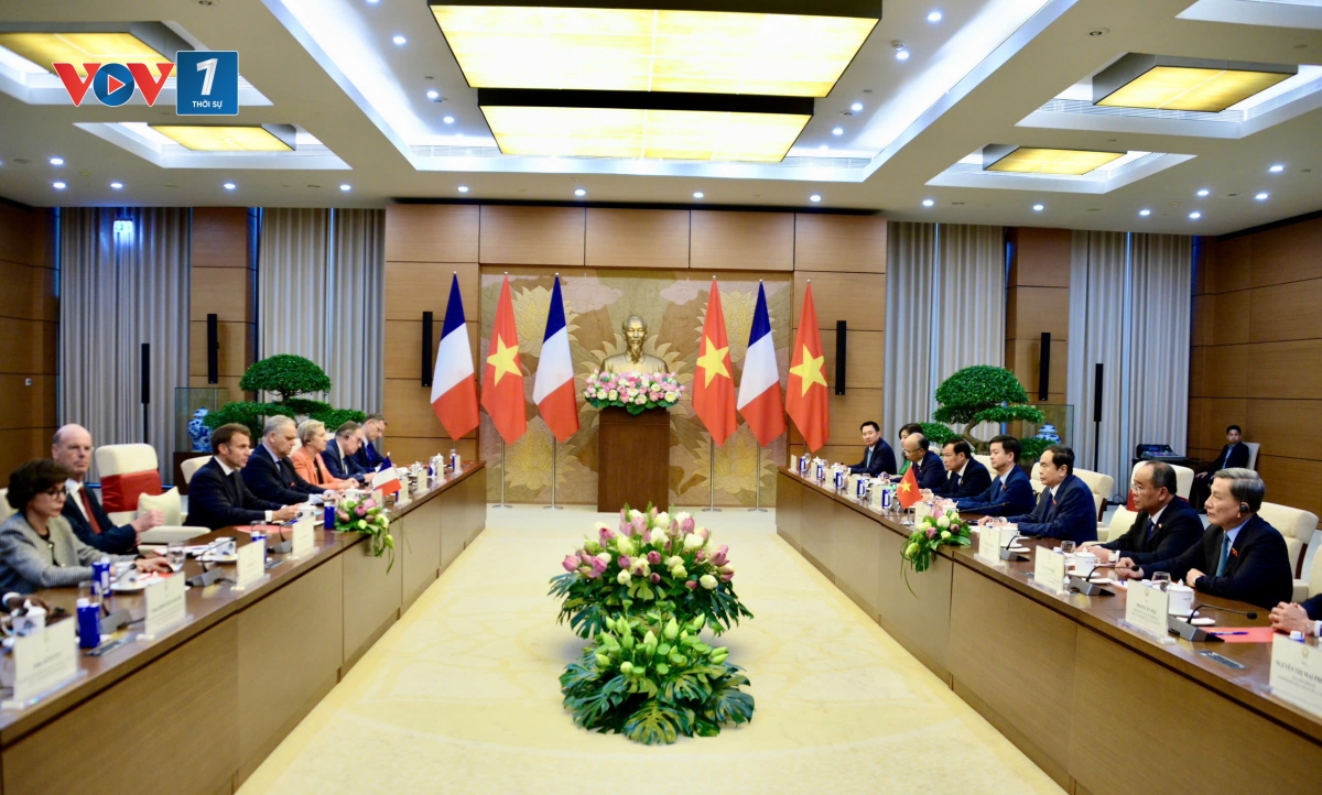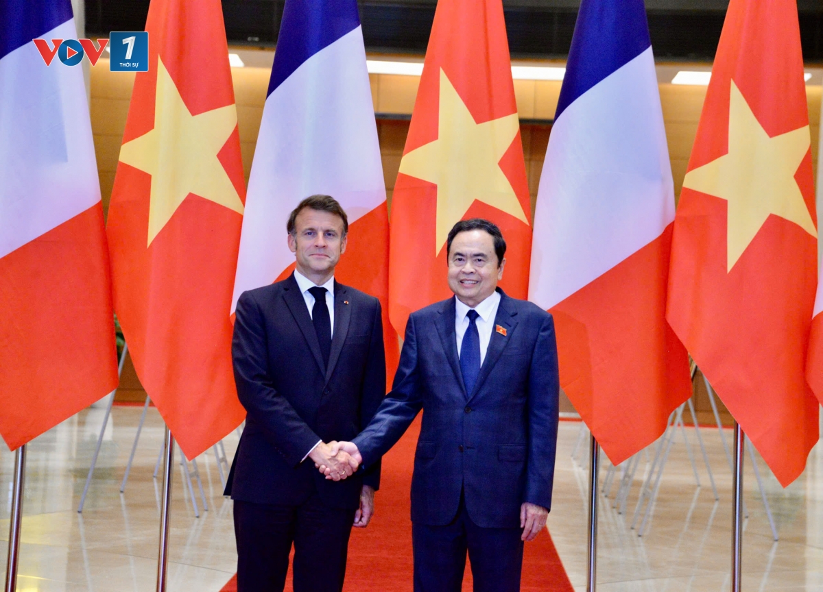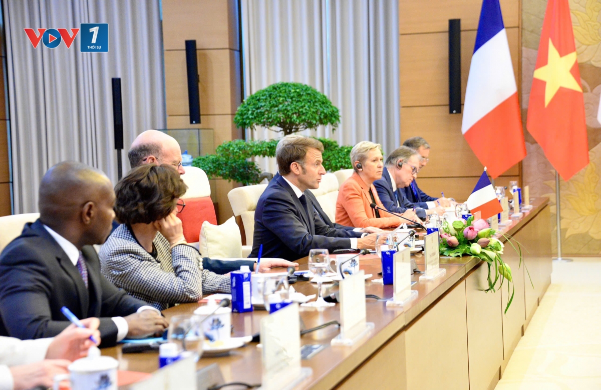 Tổng thống Pháp Emmanuel Macron bày tỏ cảm kích trước sự đón tiếp nồng hậu của Chủ tịch Quốc hội Trần Thanh Mẫn và các Lãnh đạo Đảng, Nhà nước Việt Nam; chúc mừng những thành tựu phát triển của Việt Nam và hy vọng chuyến thăm lần này sẽ mở ra những phương hướng hợp tác mới trong quan hệ Đối tác chiến lược toàn diện Việt Nam – Pháp, đặc biệt trong các lĩnh vực hạ tầng chiến lược, năng lượng mới, giao thông, logistics …