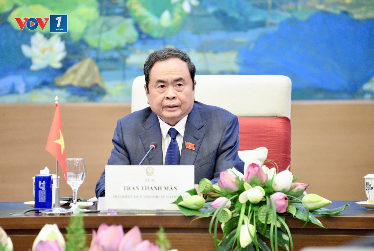 Chủ tịch Quốc hội Trần Thanh Mẫn đánh giá cao các kết quả trao đổi giữa hai cơ quan lập pháp trong năm 2024, nhất là các cuộc gặp giữa lãnh đạo Quốc hội Việt Nam và các nghị sĩ Pháp, tập trung vào các vấn đề như cải cách thể chế, chuyển đổi xanh và phát triển kinh tế số.