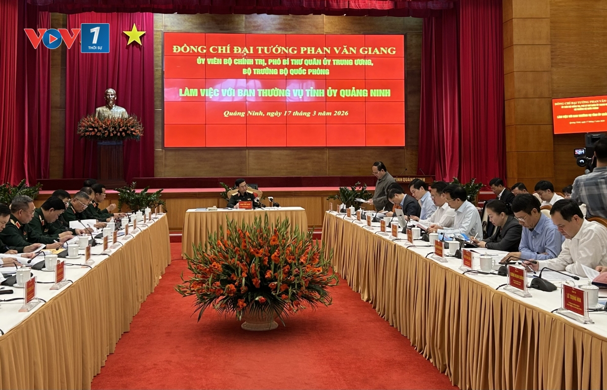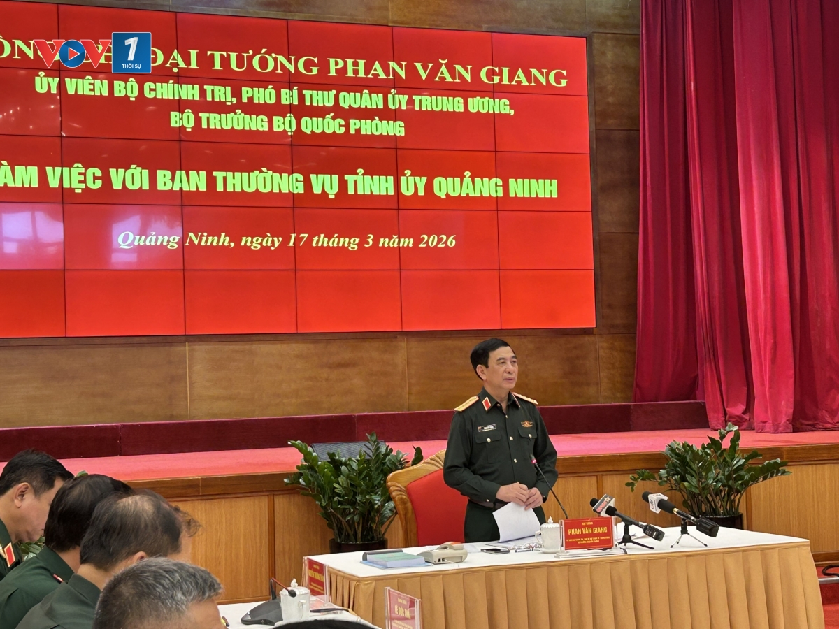 Chiều 17/3, trong khuôn khổ chương trình giao lưu hữu nghị biên giới quốc phòng Việt Nam – Trung Quốc lần thứ 10 diễn ra tại tỉnh Quảng Ninh (Việt Nam) và Khu tự trị dân tộc Choang Quảng Tây (Trung Quốc), Đại tướng Phan Văn Giang, Ủy viên Bộ Chính trị, Phó Bí thư Quân ủy Trung ương, Bộ trưởng Bộ Quốc phòng đã làm việc với Ban Thường vụ tỉnh Quảng Ninh về kết quả công tác quốc phòng, quân sự địa phương, công tác biên phòng năm 2025 và phương hướng, nhiệm vụ năm 2026 trên địa bàn tỉnh Quảng Ninh.