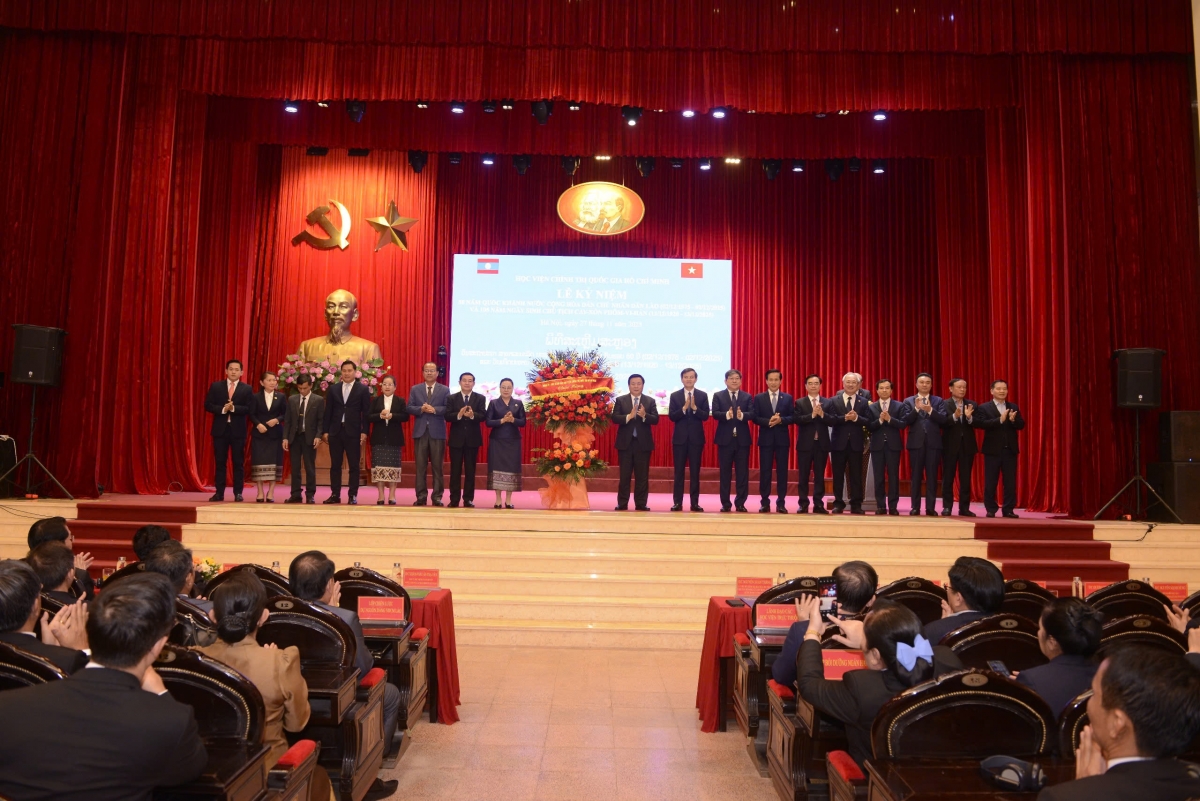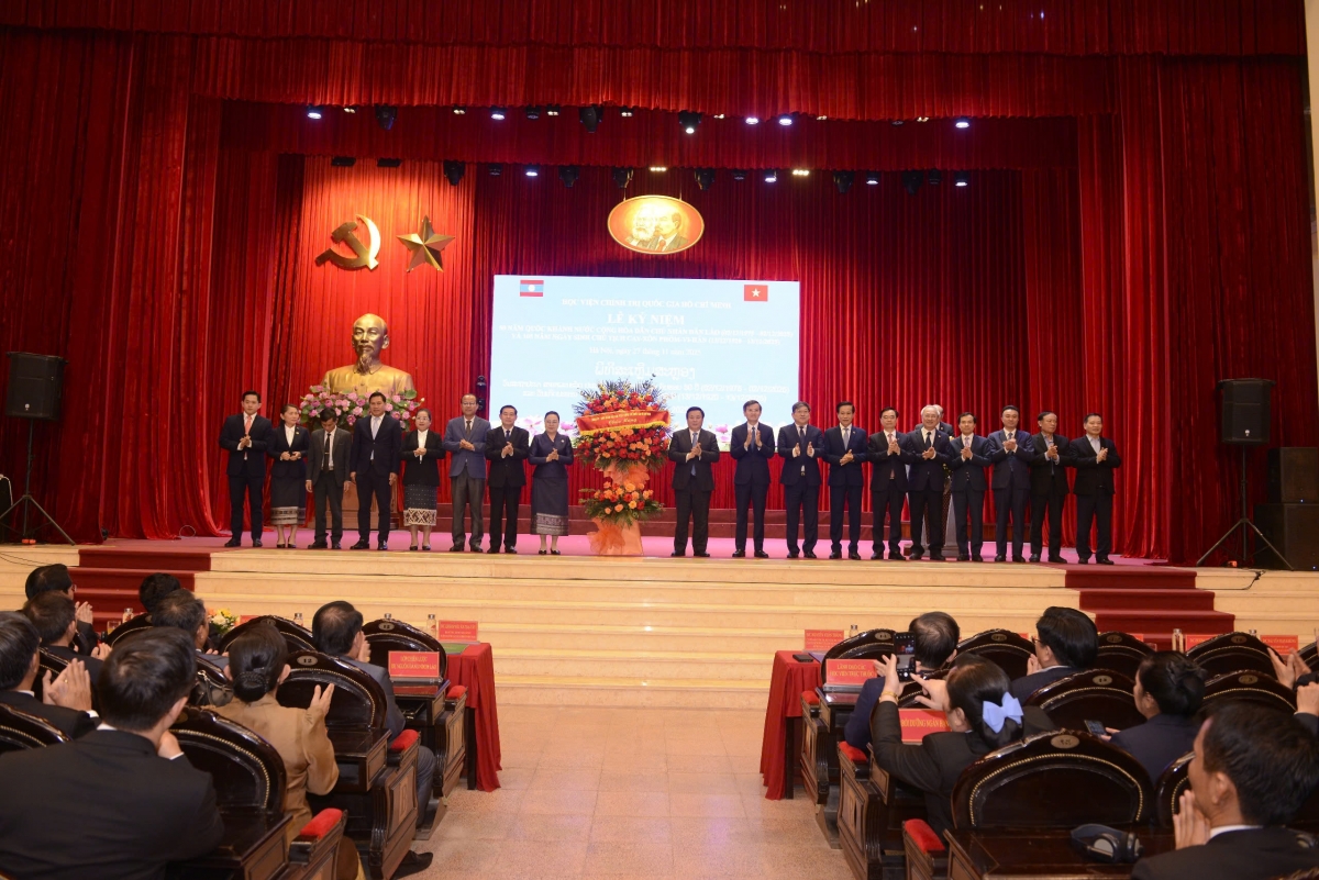 Đồng chí Nguyễn Xuân Thắng, Ủy viên Bộ Chính trị, Giám đốc Học viện Chính trị quốc gia Hồ Chí Minh, Chủ tịch Hội đồng Lý luận Trung ương; đồng chí Khăm-phâu Ân-thạ-văn Đại sứ đặc mệnh toàn quyền nước CHDCND Lào tại Việt Nam; đồng chí Pạ-đờm-phon Xổn-thạ-ni, Phó Bí thư Tỉnh ủy, Chủ tịch Uỷ ban Chính quyền tỉnh Xa-la-văn, Trưởng Đoàn lớp nghiên cứu, trao đổi chuyên đề với cán bộ cấp chiến lược dự nguồn của Đảng Nhân dân Cách mạng Lào (lớp thứ hai) cùng cán bộ, giảng viên và học viên Lào và Việt Nam dự lễ kỷ niệm.