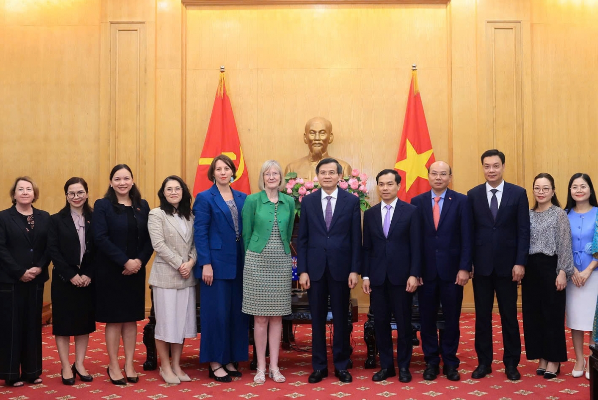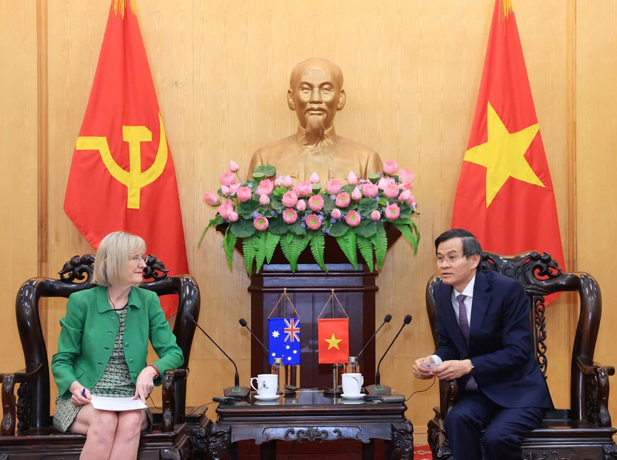 (Đề nghị bà Đại sứ cùng các đối tác Úc hết sức quan tâm. Về phía chúng tôi cũng sẽ phân bổ nguồn lực cũng như đề xuất làm sao các chương trình, dự án để đẩy hợp tác hiệu quả, đặc biệt là những nội dung hợp tác đào tạo, phát triển nhân lực cũng như các dự án nghiên cứu. Ví dụ như vấn đề giữa chuyển đổi xanh và tăng trưởng, thì tôi rất muốn tiếp tục giai đoạn tiếp theo- những dự án của chương trình Việt Úc tiếp tục được duy trì thúc đẩy và làm sao nâng lên, làm mới nó ở một chiều sâu hơn,, gắn liền với những yêu cầu rất thực tế của Việt Nam cũng như xu hướng của nhân loại cũng như mong muốn của hai Chính phủ chúng ta).