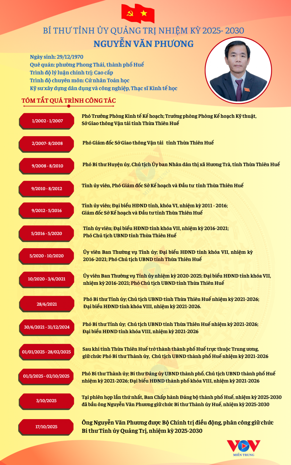 Theo quyết định của Bộ Chính trị, ông Nguyễn Văn Phương thôi tham gia Ban Chấp hành, Ban Thường vụ Thành ủy Huế nhiệm kỳ 2025-2030; Điều động, chỉ định ông Nguyễn Văn Phương tham gia Ban Chấp hành, Ban Thường vụ Tỉnh ủy Quảng Trị và giữ chức Bí thư Tỉnh ủy Quảng Trị nhiệm kỳ 2025-2030.