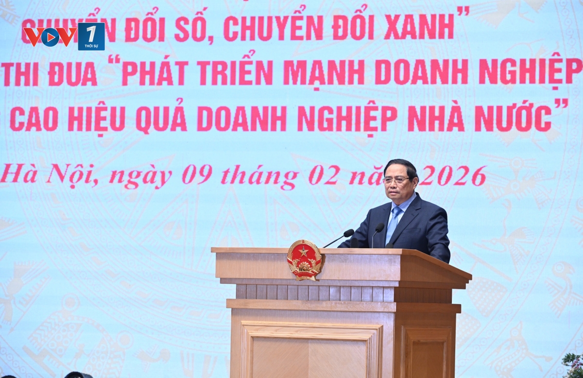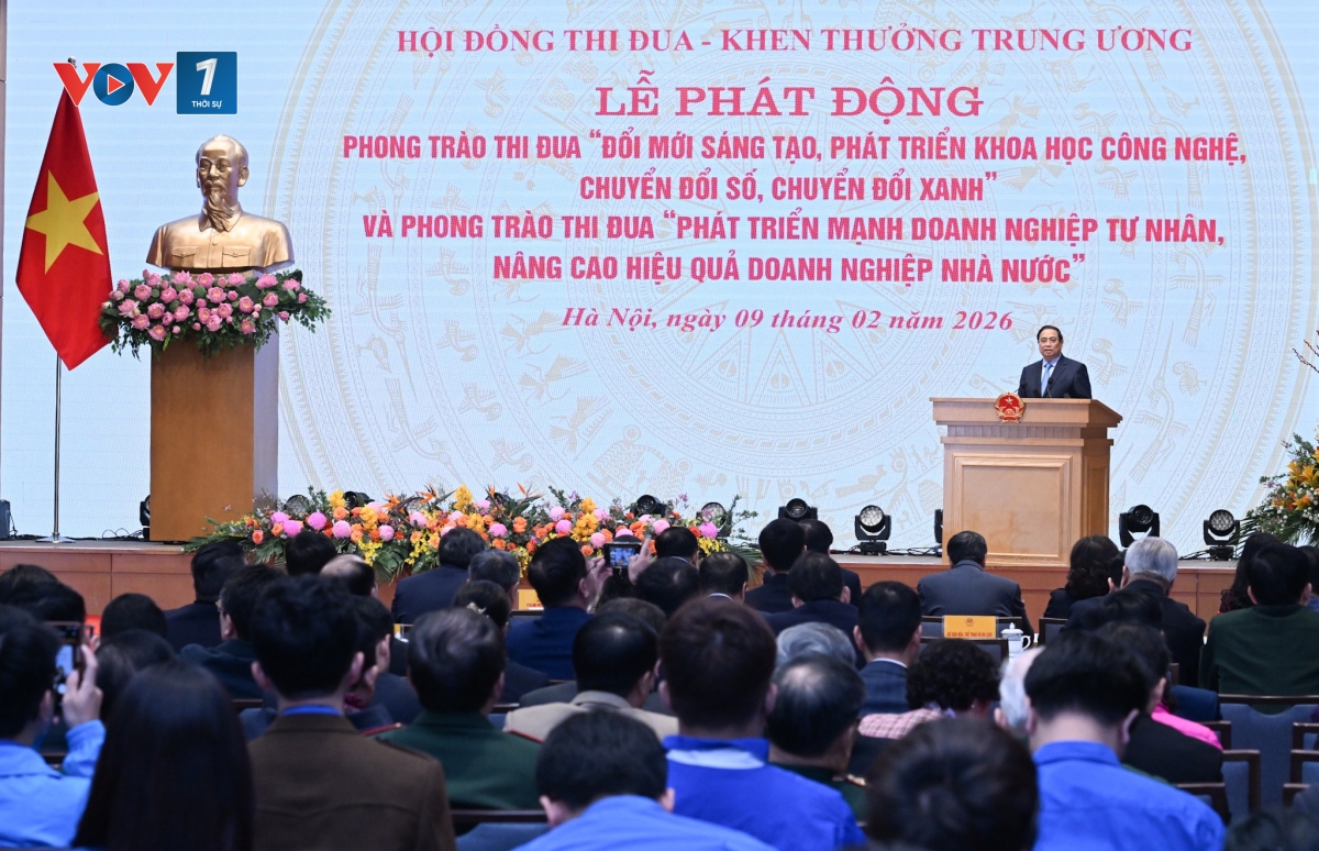 "Tôi trân trọng tuyên bố phát động 2 Phong trào thi đua "Đổi mới sáng tạo, phát triển khoa học công nghệ, chuyển đổi số, chuyển đổi xanh" và "Phát triển mạnh doanh nghiệp tư nhân, nâng cao hiệu quả doanh nghiệp nhà nước" với tinh thần "Số hóa tạo đà - Xanh hóa lan tỏa - Doanh nghiệp bứt phá - Đất nước vươn xa", thể hiện tình yêu nước, ý chí quyết tâm tự lự tự cường của nhân dân", Thủ tướng nhấn mạnh.