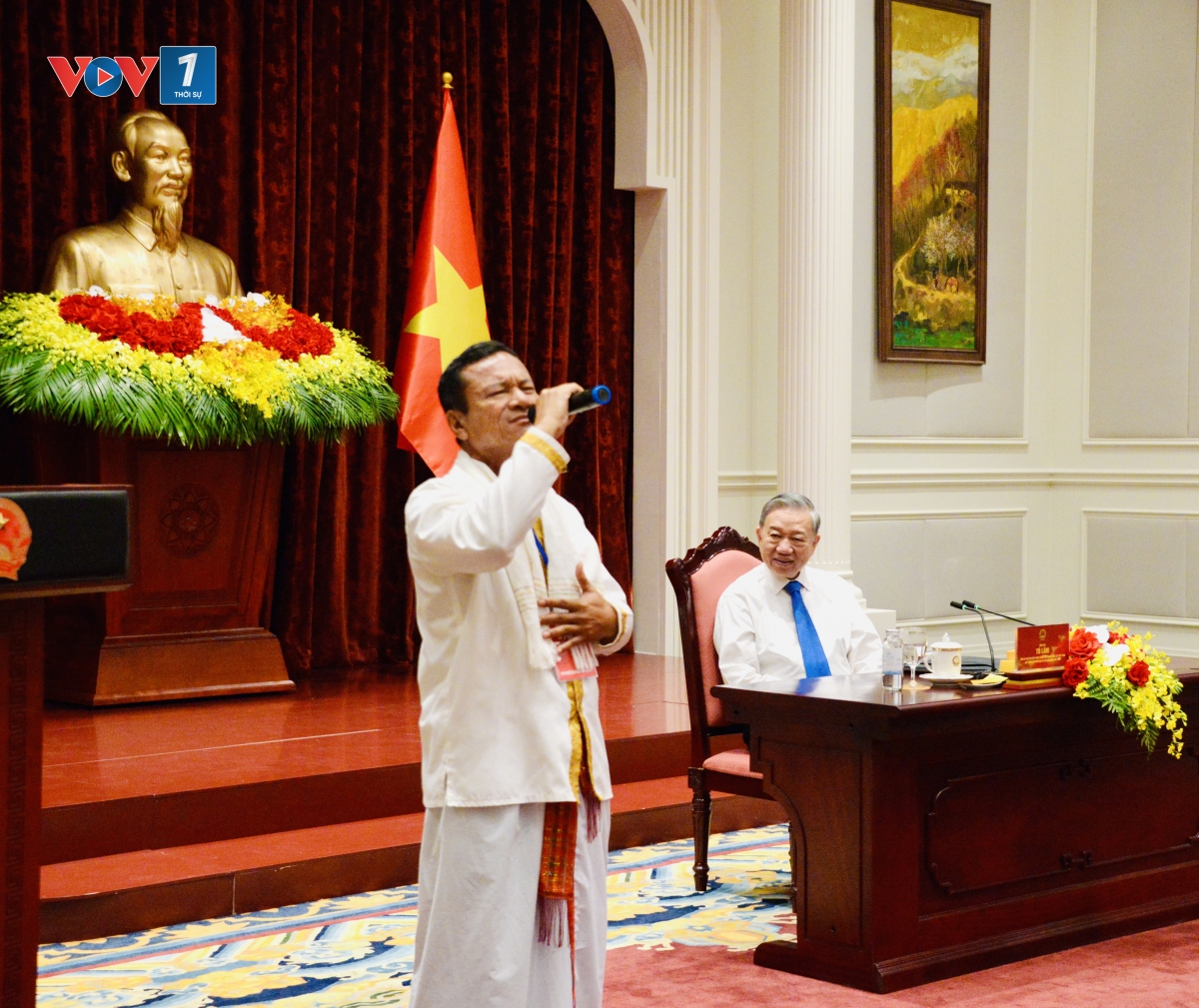 Chính vì vậy, thời gian tới, Tổng Bí thư, Chủ tịch nước Tô Lâm đề nghị và mong muốn, các nghệ nhân tiếp tục truyền dạy cho lớp trẻ, để tiếng nói, làn điệu dân ca, nghề truyền thống được nối dài trong đời sống hôm nay. Có thể nói còn tiếng nói, còn phong tục, còn những điệu hát, điệu múa – là còn hồn cốt của dân tộc; đồng thời, cần quan tâm tạo điều kiện để văn hóa được thực hành trong đời sống, có không gian để gìn giữ và lan tỏa, để mỗi người dân, mỗi cộng đồng thực sự trở thành chủ thể của quá trình bảo tồn và phát triển văn hóa; ”Cùng nhau giữ vững sự bình yên của bản làng, góp phần ổn định từ cơ sở. Bằng uy tín, bằng trách nhiệm và bằng tình cảm gắn bó với Nhân dân, các đồng chí, bác, các anh chị tiếp tục nêu gương, vận động bà con không nghe theo những lời xúi giục sai trái, không vi phạm pháp luật, không để các yếu tố tiêu cực xâm nhập cộng đồng. Giữ cho bản làng bình yên cũng chính là góp phần giữ vững sự ổn định chung của đất nước. Cùng nhau đổi mới nếp nghĩ, cách làm để phát triển bền vững quê hương, đất nước. Tôi mong các đồng chí, các bác, các anh chị tiếp tục vận động bà con phát huy tinh thần tự lực, chủ động vươn lên, phát triển kinh tế gia đình, xóa bỏ hủ tục, xây dựng đời sống văn minh. Bảo tồn văn hóa cần gắn chặt với phát triển sinh kế, nhất là du lịch cộng đồng, để người dân vừa gìn giữ bản sắc, vừa nâng cao thu nhập, từ đó tạo động lực lâu dài cho việc bảo tồn và phát huy văn hóa. Phát triển không chỉ là có thêm cái mới, mà còn là giữ gìn và phát huy cho được những giá trị tốt đẹp vốn có của mình”, Tổng Bí thư, Chủ tịch nước Tô Lâm nói.