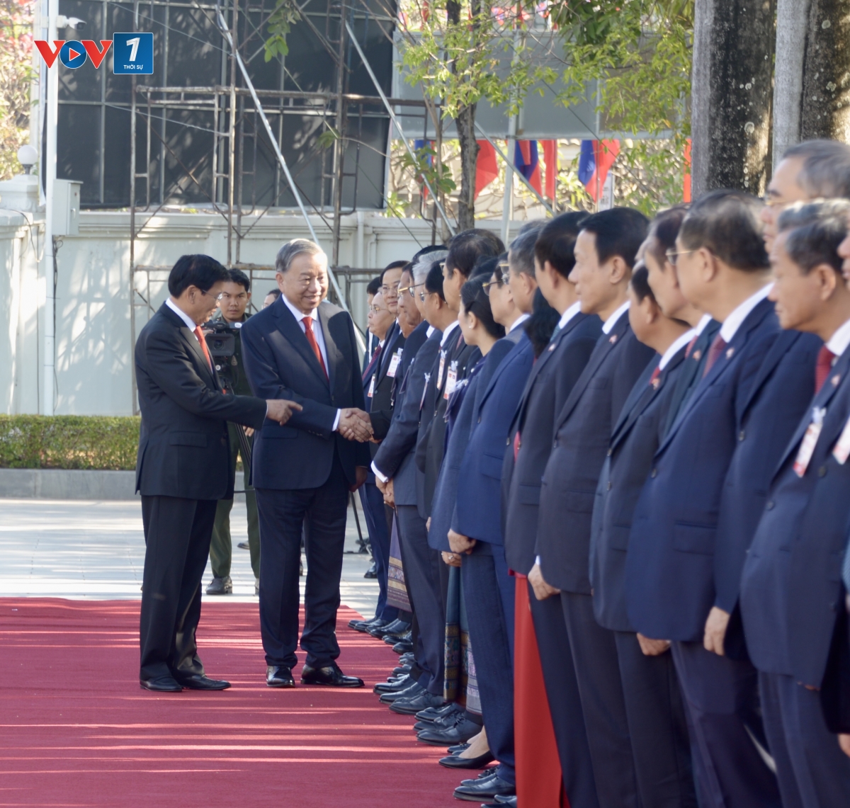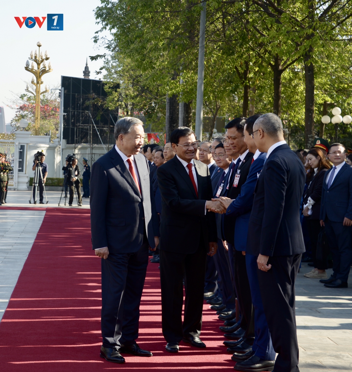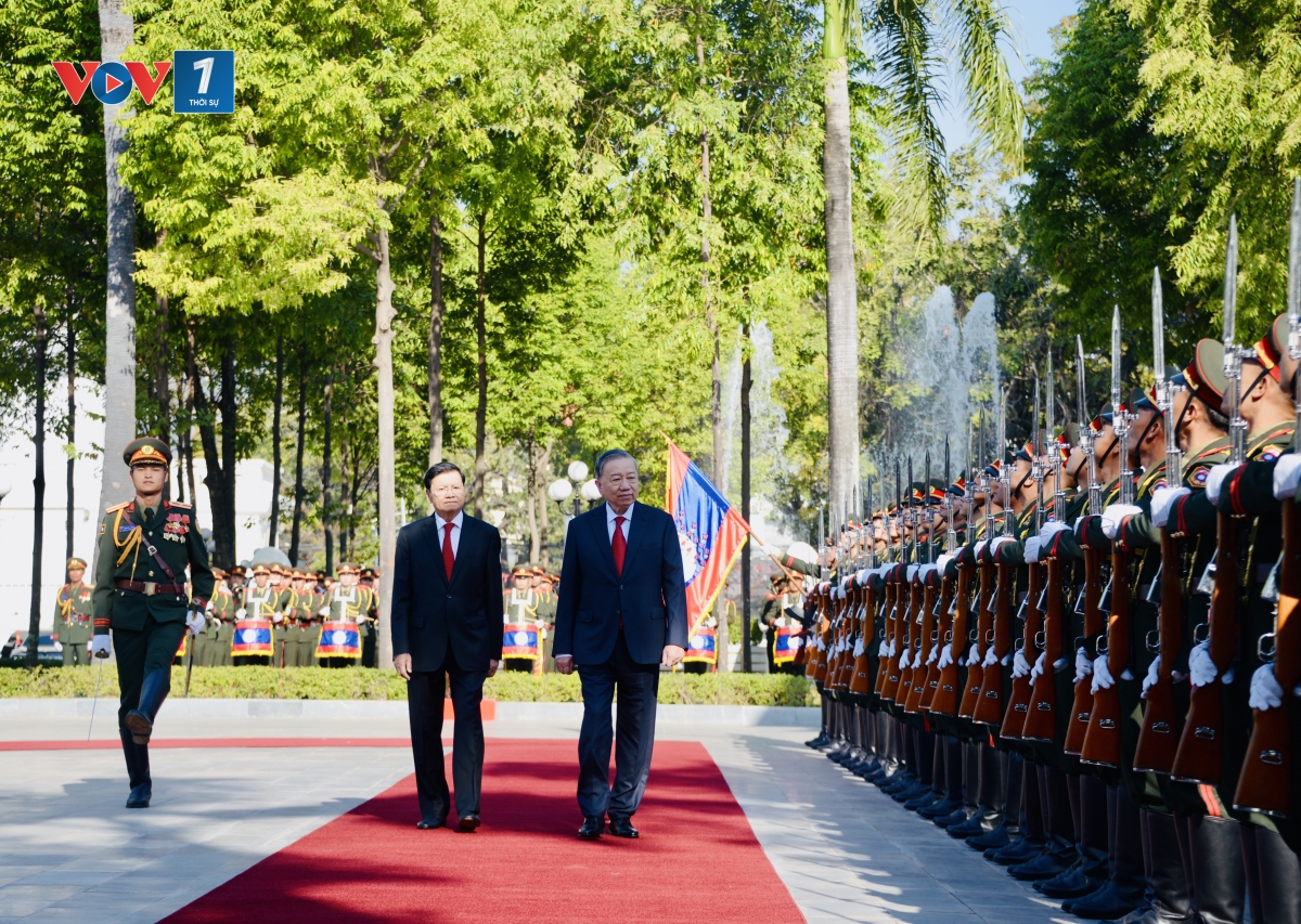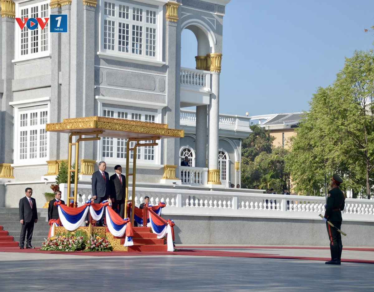 Đúng 9h giờ, đoàn xe chở Tổng Bí thư Tô Lâm tiến vào Phủ Chủ tịch, Tổng Bí thư, Chủ tịch Lào Thoong-lun Xi-xu-lít ra tận cửa xe nồng nhiệt chào đón và mời Tổng Bí thư Tô Lâm bước lên bục danh dự. Quân nhạc cử quốc thiều Việt Nam và Lào.