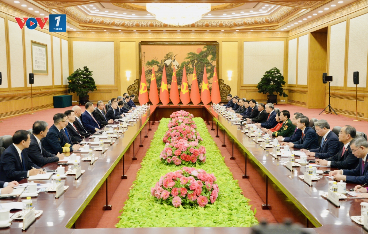 Ngay sau lễ đón chính thức, Tổng Bí thư, Chủ tịch Trung Quốc Tập Cận Bình dẫn đầu Đoàn đại biểu cấp cao Trung Quốc và Tổng Bí thư, Chủ tịch nước Tô Lâm dẫn đầu Đoàn đại biểu cấp cao nước ta đang có buổi hội đàm cấp cao nhằm thông báo cho nhau về tình hình mỗi Đảng, mỗi nước, đi sâu trao đổi việc tăng cường và làm sâu sắc hơn nữa quan hệ song phương trong thời gian tới.