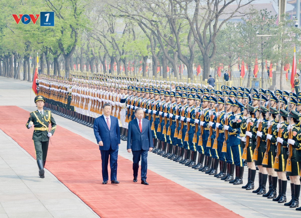 Nồng nhiệt chào đón Tổng Bí thư, Chủ tịch nước Tô Lâm thăm cấp Nhà nước tới Trung Quốc; Tổng Bí thư, Chủ tịch Trung Quốc Tập Cận Bình mời Tổng Bí thư, Chủ tịch nước Tô Lâm bước lên bục danh dự. Quân nhạc cử quốc thiều Việt Nam và Trung Quốc.