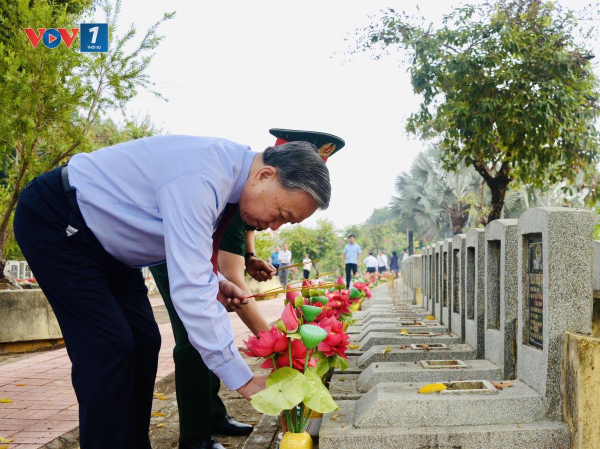 Sau lễ viếng, Tổng Bí thư, Chủ tịch nước Tô Lâm cùng đoàn cômg tác đã thắp hương trên từng phần mộ liệt sĩ, bày tỏ lòng thành kính và biết ơn sâu sắc các anh hùng liệt sĩ đã hy sinh vì sự nghiệp đấu tranh giải phóng dân tộc, thống nhất đất nước.