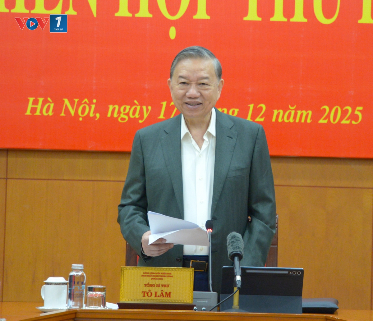 Sáng nay (17/12) tại Trụ sở Trung ương Đảng, Tổng Bí thư Tô Lâm chủ trì phiên họp thứ 2 Ban Chỉ đạo Trung ương về hoàn thiện thể chế và pháp luật. Cùng dự có Thủ tướng Phạm Minh Chính, Chủ tịch Quốc hội Trần Thanh Mẫn, các đồng chí Uỷ viên Bộ Chính trị, Chủ tịch Ủy ban Trung ương Mặt trận Tổ quốc Việt Nam Bùi Thị Minh Hoài, Trưởng Ban Tổ chức Trung ương Lê Minh Hưng, Trưởng Ban Nội chính Trung ương Phan Đình Trạc và Bí thư Thành uỷ Hà Nội Nguyễn Duy Ngọc.