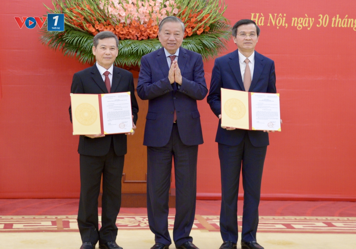 Thay mặt Bộ Chính trị, trao Quyết định phân công bổ nhiệm và chúc mừng 2 đồng chí Lê Minh Trí, Uỷ viên Bộ Chính trị, Bí thư Trung ương Đảng, Phó trưởng Ban thường trực Ban Nội chính Trung ương đảm nhận chức vụ Trưởng Ban Nội chính Trung ương và đồng chí Đoàn Minh Huấn, Uỷ viên Bộ Chính trị, Phó giám đốc thường trực Học viện Chính trị Quốc gia Hồ Chí Minh đảm nhận chức vụ Giám đốc Học viện Chính trị Quốc gia Hồ Chí Minh, Tổng Bí thư Tô Lâm cũng ghi nhận những đóng góp rất tâm huyết, trí tuệ, bản lĩnh của các đồng chí Phan Đình Trạc và đồng chí Nguyễn Xuân Thắng trong nhiệm kỳ Đại hội 13 vừa qua; đồng thời cho biết, các đồng chí Lê Minh Trí và Đoàn Minh Huấn đều là những những cán bộ có nhiều kinh nghiệm, thời gian công tác và trưởng thành từ nhiều cơ quan đơn vị và địa phương để lại nhiều dấu ấn trên các cương vị công tác của mình trong thời gian qua:”Việc Bộ Chính trị phân công, bổ nhiệm các đồng chí giữ cương vị trọng trách mới, thể hiện sự tin tưởng, đánh giá cao đối với năng lực của những đóng góp các đồng chí trong thời gian vừa qua. Chúng tôi cũng tin tưởng rằng với bề dày công tác trong những lĩnh vực được giao nhiệm vụ, sự ủng hộ, giúp đỡ của các cơ quan, đơn vị, trước hết là các Ban của Đảng, cơ quan Chính phủ, của Quốc hội, các địa phương, của cả hệ thống chính trị đồng chí Lê Minh Trí và đồng chí Đoàn Minh Huấn sẽ có những đóng góp quan trọng cùng Ban Chấp hành Trung ương, Bộ Chính trị, Ban Bí thư tiếp tục lãnh đạo, chỉ đạo, đưa các mặt công tác nội chính, công tác phòng chống tham nhũng, lãng phí, tiêu cực, cải cách tư pháp đi vào chiều sâu theo đúng tinh thần Nghị quyết ĐH 14, đưa Học viện Chính trị Quốc gia Quốc gia Hồ Chí Minh phát triển mạnh mẽ thực sự là trường Đảng cao cấp là trung tâm quốc gia đào tạo, bồi dưỡng cán bộ nghiên cứu, khoa học lý luận chủ nghĩa Mác Lênin, tư tưởng Hồ Chí Minh và lý luận về đường lối đổi mới, bảo vệ vững chắc nền tảng tư tưởng của Đảng, đấu tranh phản bác hiệu quả các quan điểm sai trái, thù địch.” Tổng Bí thư Tô Lâm nêu rõ.