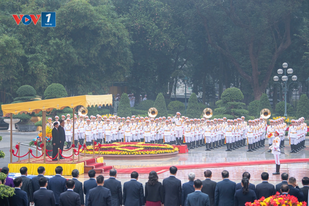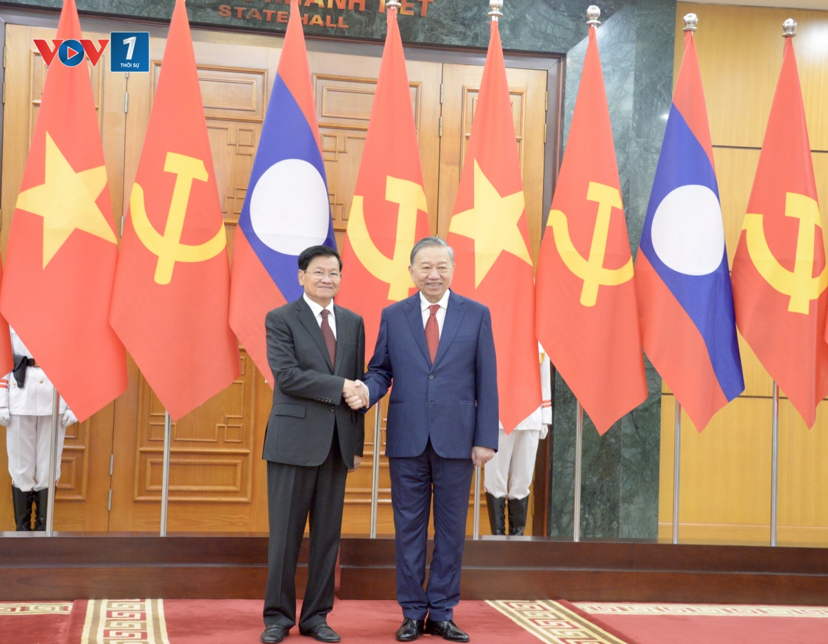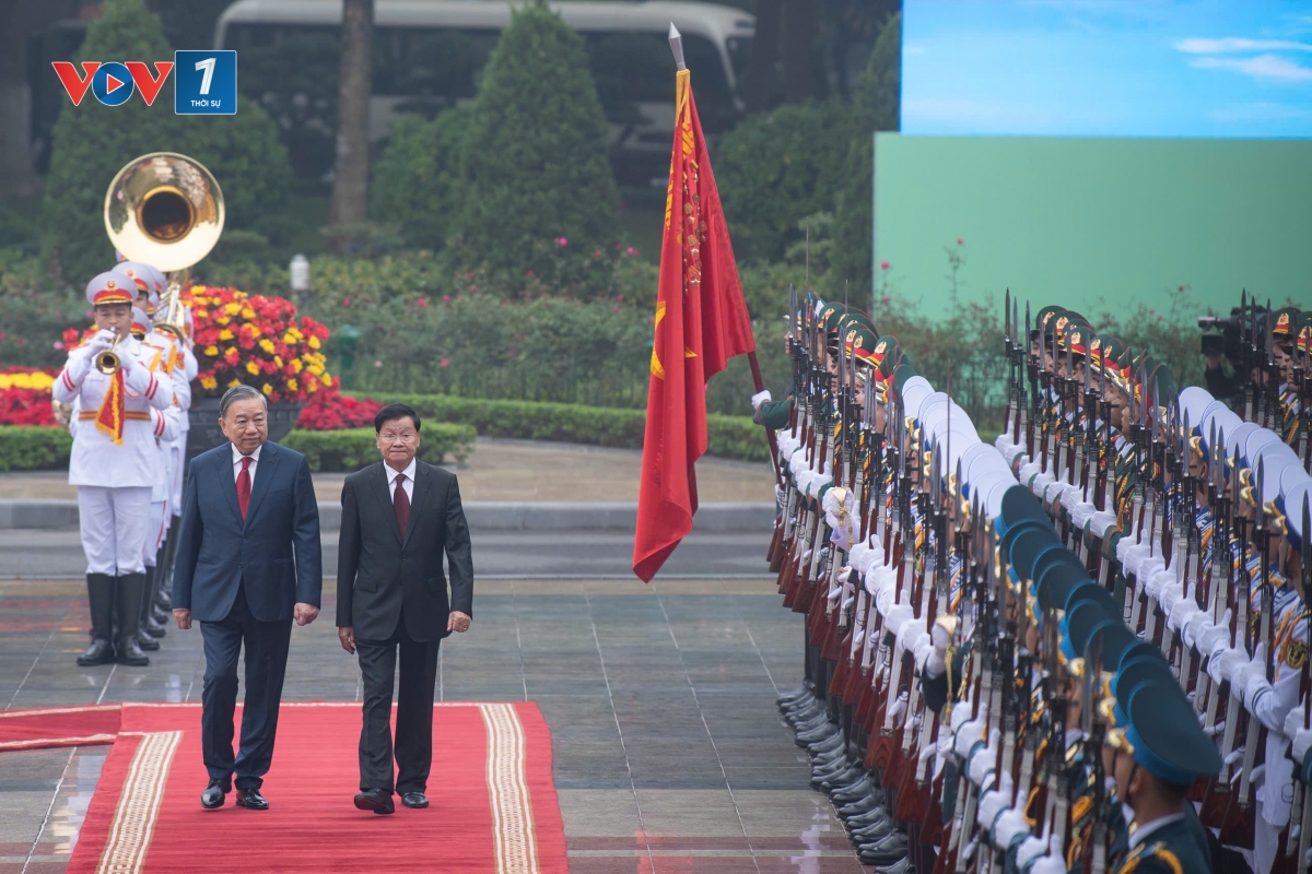 Tổng Bí thư Tô Lâm mời Tổng Bí thư, Chủ tịch nước Lào Thongloun Sisoulith duyệt Đội Danh dự Quân đội nhân dân Việt Nam. Sau duyệt Đội Danh dự, Tổng Bí thư Tô Lâm và Tổng Bí thư, Chủ tịch nước Lào Thongloun Sisoulith cùng tới chào các thành viên Đoàn Cấp cao hai nước dự Lễ đón.