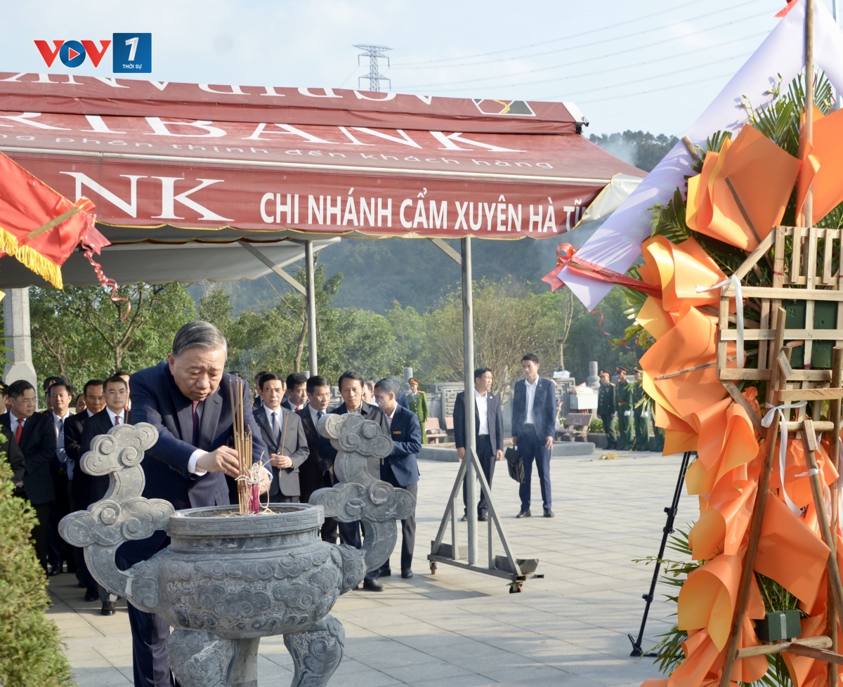 Tiếp đó, tại tại Khu Di tích Lịch sử cấp quốc gia đặc biệt Ngã ba Đồng Lộc, Tổng Bí thư Tô Lâm và Đoàn công tác Trung ương đã dâng hương, đặt vòng hoa tại Nhà bia tưởng niệm liệt sĩ thanh niên xung phong toàn quốc và khu mộ 10 nữ Anh hùng liệt sĩ thanh niên xung phong đã anh dũng hy sinh tại Ngã ba Đồng Lộc.