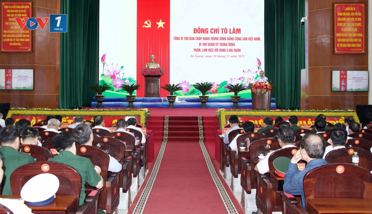 Sáng ngày 20/11 tại An Giang, Tổng Bí thư Tô Lâm, Bí thư Quân uỷ Trung ương tới thăm và chủ trì buổi làm việc với Bộ Tư lệnh Vùng cảnh sát biển 4 và cán bộ chiến sỹ Vùng 5 Hải quân. Cùng đi với Tổng Bí thư có các đồng chí Uỷ viên Bộ Chính trị, Trưởng Ban Tổ chức Trung ương Lê Minh Hưng, Phó Thủ tướng thường trực Nguyễn Hoà Bình, Giám đốc Học viện Chính trị Quốc gia Hồ Chí Minh, Chủ tịch Hội đồng Lý luận Trung ương Nguyễn Xuân Thắng, Chủ tịch Uỷ ban Trung ương Mặt trận Tổ quốc Việt Nam Bùi Thị Minh Hoài, Đại tướng Phan Văn Giang, Bộ trưởng Bộ Quốc phòng, Đại tướng Lương Tam Quang, Bộ trưởng Bộ Công an và Bí thư Thành uỷ Hà Nội Nguyễn Duy Ngọc.