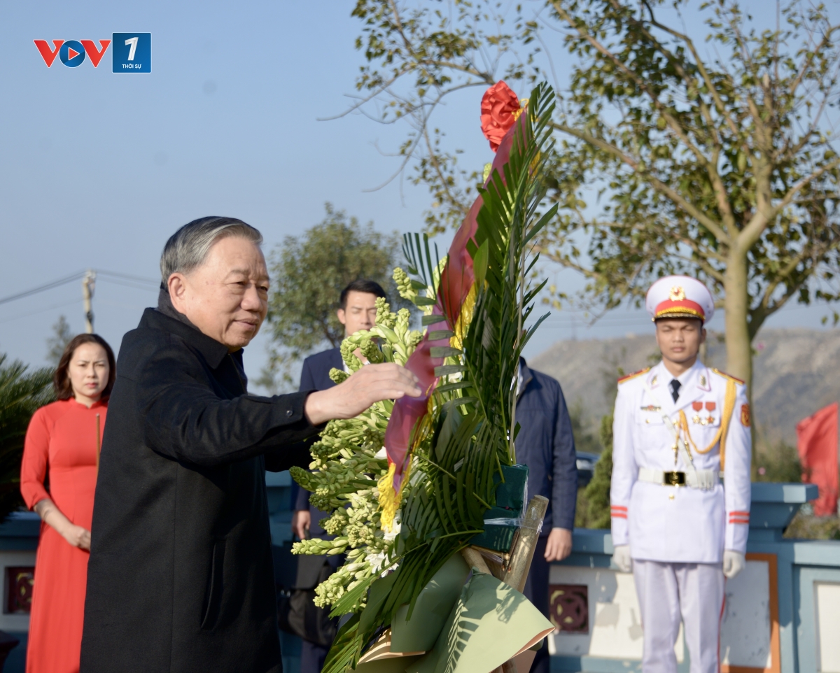 Trước đó, đầu giờ sáng nay Tổng Bí thư Tô Lâm cùng đoàn công tác Trung ương tới dâng hương dâng hoa tưởng nhớ Chủ tịch Hồ Chí Minh tại khu Di tích lịch sử quốc gia nơi Bác Hồ về thăm mỏ Đèo Nai; thăm, chúc Tết cán bộ, công nhân, người lao động tại khai trường Công ty CP Than Đèo Nai - Cọc Sáu – trên địa bàn phường Cẩm Phả, tỉnh Quảng Ninh.