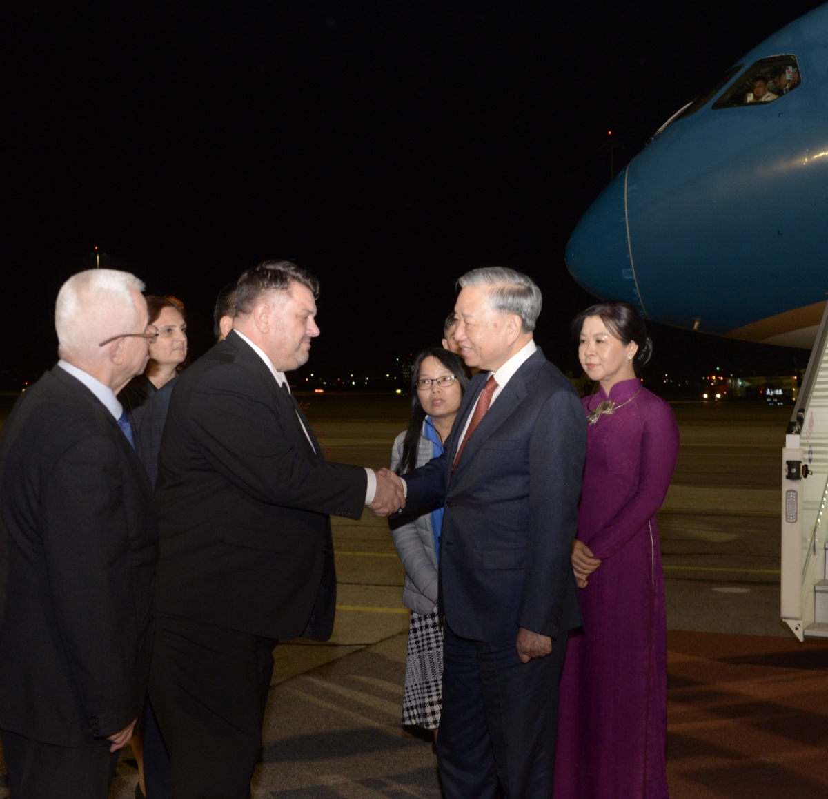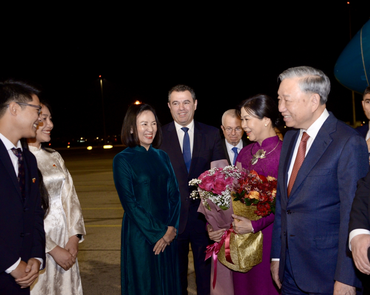 Đón Tổng Bí thư và Phu nhân tại sân bay có ông Atanas Zafirov, Chủ tịch Đảng Xã hội chủ nghĩa, Phó Thủ tướng Chính phủ Bungaria, ông Roussi Ivanov, Thư ký đối ngoại Phủ Tổng thống Bungaria, ông Mircho Ivanov, Cục trưởng Cục lễ tân Phủ Tổng thống Bungaria, Đại sứ Việt Nam tại Bungaria Nguyễn Thị Minh Nguyệt cùng đại diện cộng đồng người Việt Nam tại Bungaria.