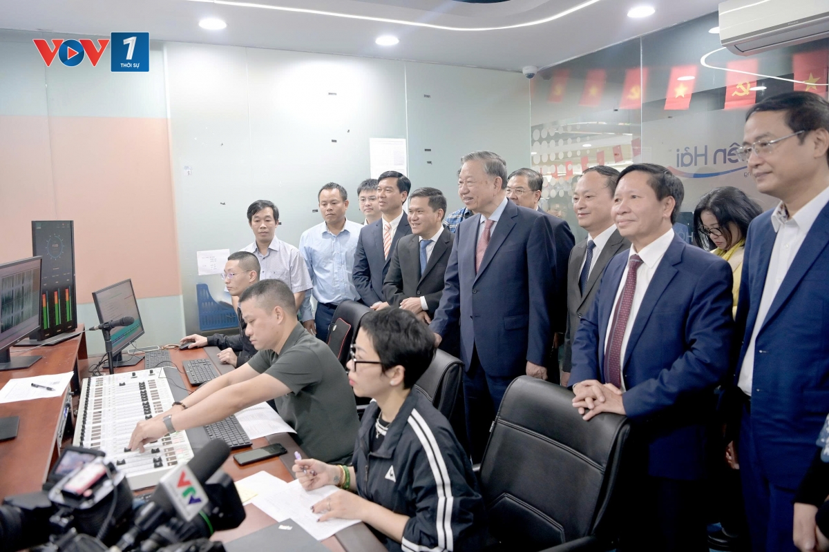 Tại Đài TNVN, Tổng Bí thư Tô Lâm và Đoàn công tác đã trực tiếp tới kiểm tra công tác ứng trực của cán bộ công nhân viên, kỹ thuật viên Ban VOV Giao thông quốc gia.