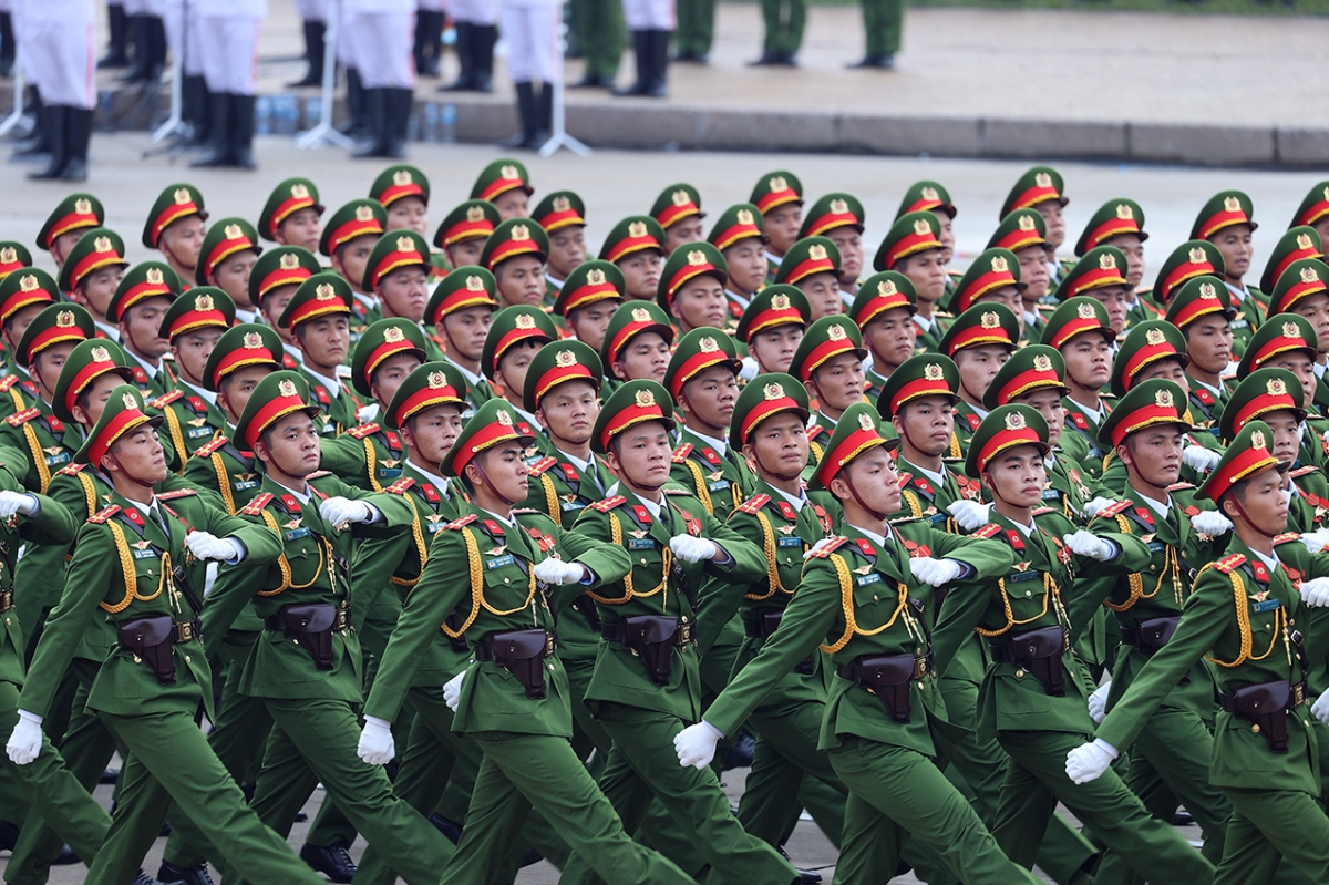 Tham gia tổng duyệt đi qua lễ đài lần lượt là 26 khối Quân đội; 4 khối quân đội nước ngoài, gồm: Cộng hòa nhân dân Trung Hoa, Liên bang Nga, Cộng hòa Dân chủ Nhân dân Lào và Vương quốc Campuchia; tiếp đến là khối dân quân, du kích; 17 khối Công an; 14 khối xe pháo quân sự; 9 khối xe đặc chủng Công an.