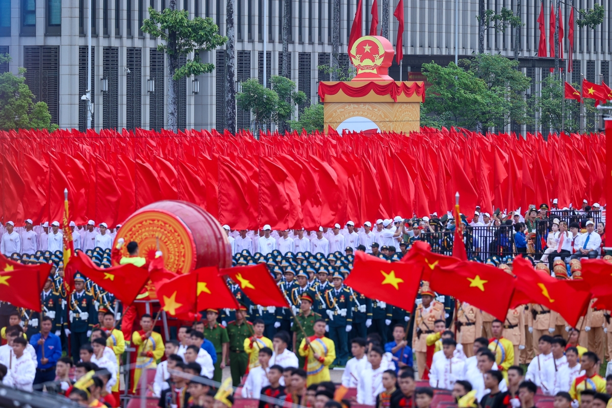 Tiếp sau các khối lực lượng vũ trang là khối Hồng kỳ mở đầu cho phần diễu hành của 12 khối quần chúng, trong đó, đi đầu là khối Mặt trận Tổ quốc Việt Nam và khối đại diện 54 dân tộc Việt Nam.