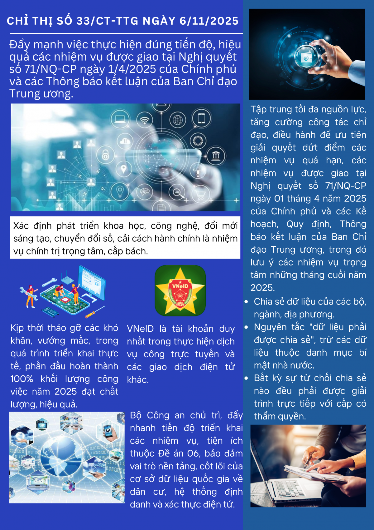Tại Chỉ thị số 33/CT-TTg về đẩy mạnh việc thực hiện đúng tiến độ, hiệu quả các nhiệm vụ được giao tại Nghị quyết số 71/NQ-CP ngày 1/4/2025 của Chính phủ và các Thông báo kết luận của Ban Chỉ đạo Trung ương, Thủ tướng Chính phủ yêu cầu các bộ, cơ quan ngang bộ, cơ quan thuộc Chính phủ, UBND các tỉnh, thành phố trực thuộc Trung ương cần tập trung tối đa nguồn lực để giải quyết dứt điểm các nhiệm vụ quá hạn; Phấn đấu hoàn thành 100% khối lượng công việc năm 2025 đạt chất lượng, hiệu quả.