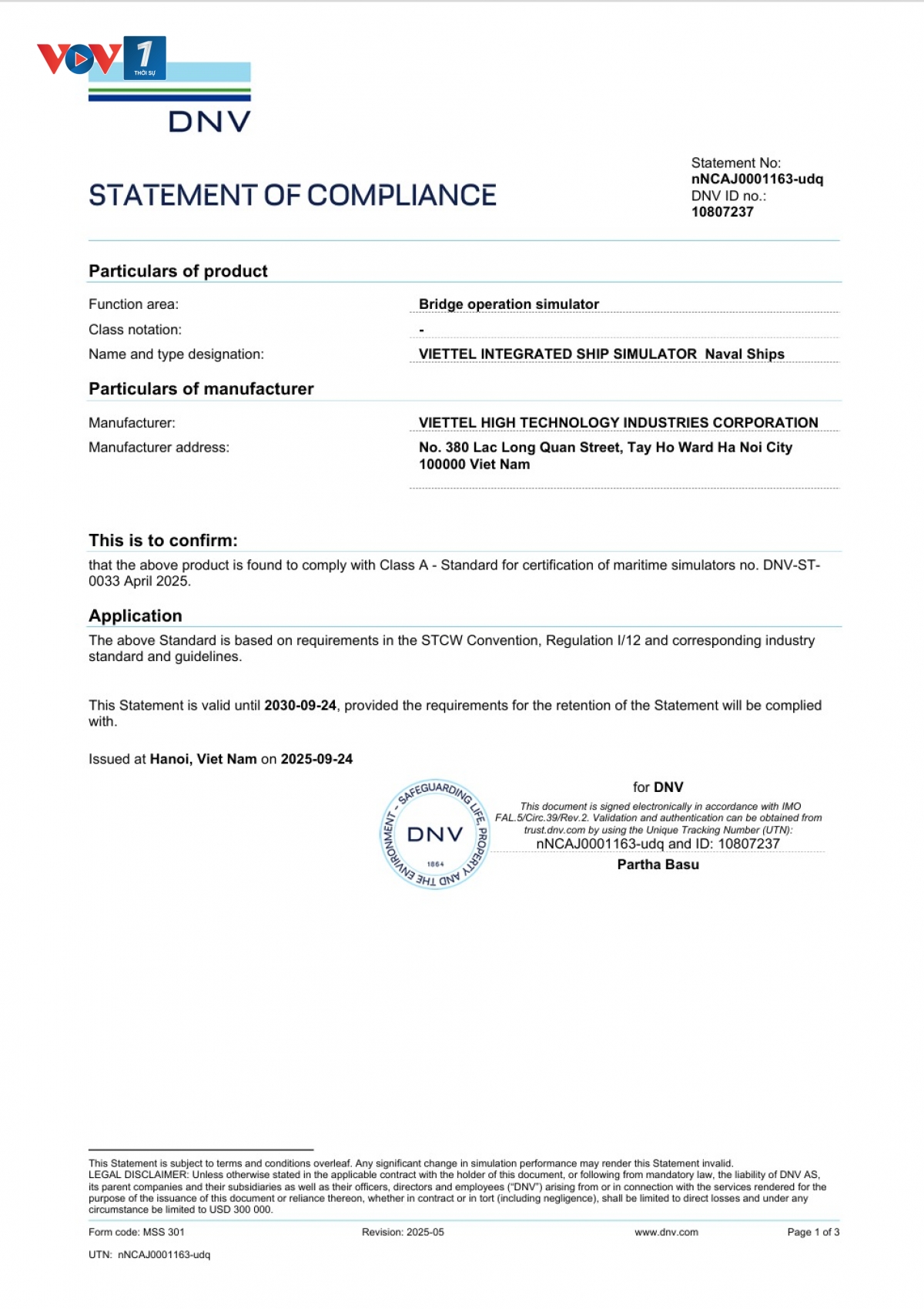 Đây là lần đầu tiên Việt Nam sở hữu một hệ thống mô phỏng hàng hải đạt chuẩn quốc tế ở mức cao nhất. Không chỉ là dấu mốc về mặt công nghệ, chứng nhận này còn trực tiếp nâng cao giá trị sử dụng của hệ thống mô phỏng đối với các đơn vị đào tạo, vận hành tàu biển trong nước và khu vực. Đối với các đơn vị đang cân nhắc đầu tư hệ thống mô phỏng, chứng nhận của DNV mà Viettel đạt được là bảo chứng quan trọng về tính hợp lệ và khả năng áp dụng trong thực tế.