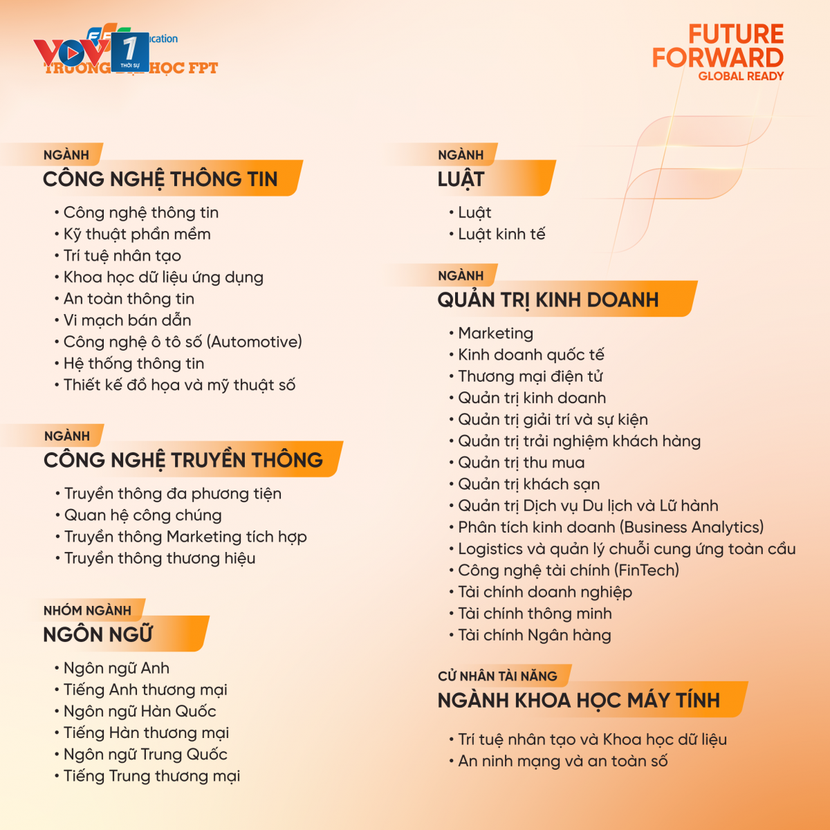 Việc bổ sung các chuyên ngành mới được FPTU xây dựng dựa trên phân tích dữ liệu thị trường, dự báo nghề nghiệp toàn cầu và tham vấn doanh nghiệp trong hệ sinh thái FPT, nhằm bảo đảm sinh viên học đúng năng lực thị trường tương lai sẽ đòi hỏi. Từ những phân tích đó, FPTU tái cấu trúc chương trình theo ba nhóm định hướng then chốt của việc làm tương lai: Công nghệ – AI – dữ liệu, Kinh doanh – dịch vụ hiện đại và Truyền thông – sáng tạo – nội dung số. Các nhóm này kết nối thành một hệ sinh thái kỹ năng toàn diện, giúp sinh viên có nền tảng công nghệ – dữ liệu vững, đồng thời phát triển tư duy sáng tạo và khả năng làm việc trong môi trường toàn cầu.
