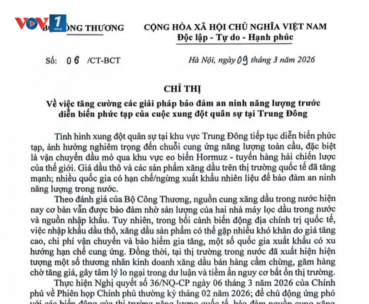 Trước những diễn biến phức tạp của tình hình xung đột quân sự tại khu vực Trung Đông có thể ảnh hưởng đến chuỗi cung ứng năng lượng toàn cầu, Bộ Công Thương đã ban hành Chỉ thị số 06/CT-BCT ngày 09/3/2026 về việc tăng cường các giải pháp bảo đảm an ninh năng lượng và ổn định nguồn cung xăng dầu trong nước.Chỉ thị do Quyền Bộ trưởng Lê Mạnh Hùng ký.