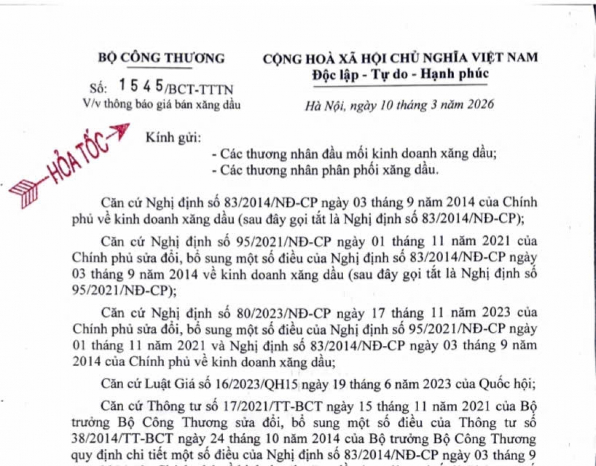 Liên Bộ Công Thương – Tài chính vừa có văn bản hoả tốc về việc điều hành giá xăng dầu, áp dụng từ 23 giờ 45 ngày 10/3/2026. Tại kỳ điều hành này, cơ quan quản lý không trích lập Quỹ Bình ổn giá xăng dầu đối với tất cả các mặt hàng. Đồng thời, chi sử dụng Quỹ Bình ổn ở mức khá mạnh để kiềm chế đà tăng của giá xăng dầu trong nước.