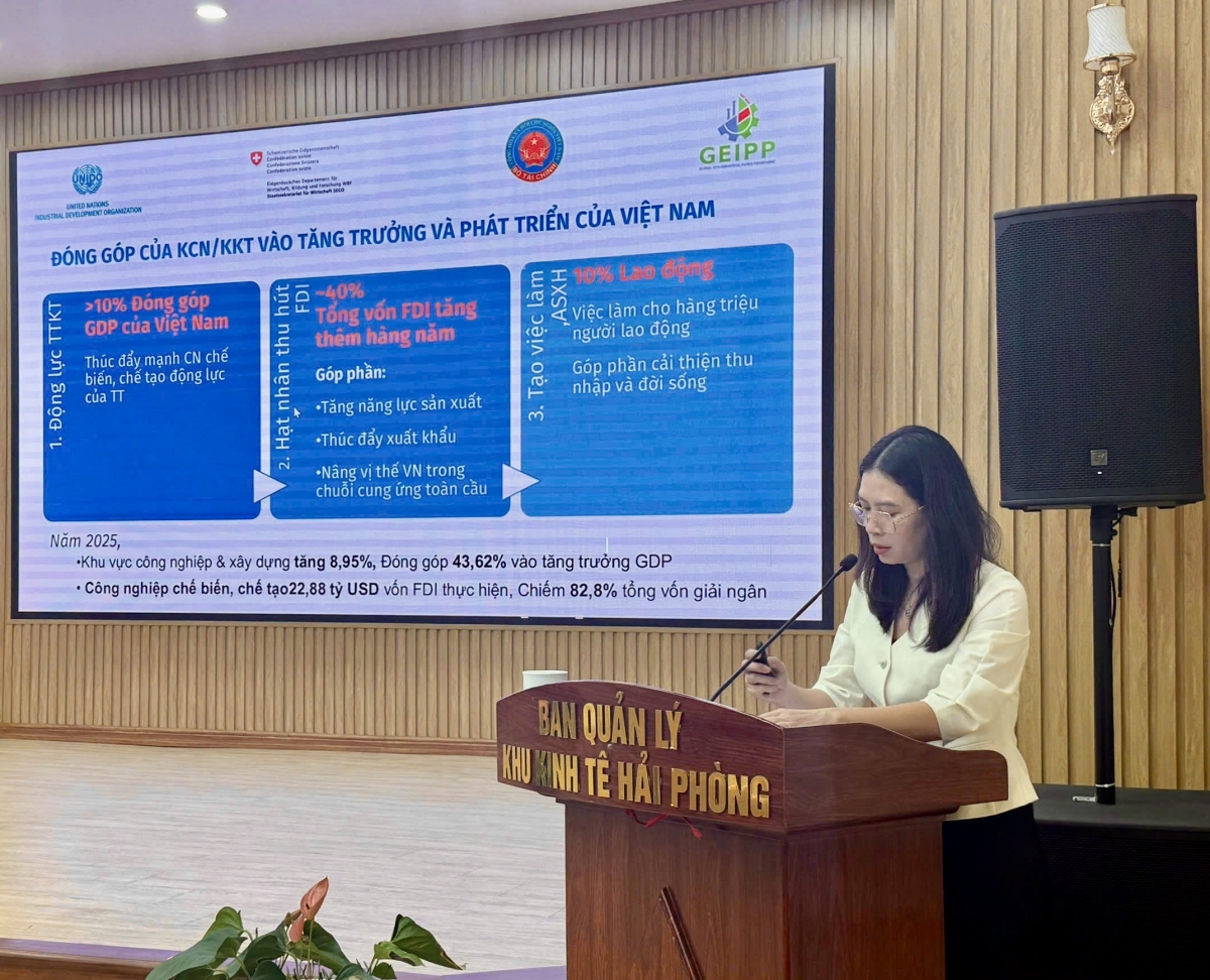 Ông Dương Văn Xuyên, Phó Trưởng ban Ban Quản lý Khu kinh tế Hải Phòng khẳng định quyết tâm của Ban Quản lý trong việc thúc đẩy chuyển đổi khu công nghiệp theo hướng sinh thái một cách thực chất và hiệu quả. Trong thời gian tới, Ban Quản lý sẽ tập trung triển khai quyết liệt một số nhiệm vụ trọng tâm, bao gồm: đẩy mạnh đầu tư và hoàn thiện hạ tầng khu công nghiệp theo hướng xanh; phấn đấu đưa các khu công nghiệp trọng điểm như: Nam Cầu Kiền và Đình Vũ đáp ứng tiêu chí khu công nghiệp sinh thái; đồng thời thúc đẩy áp dụng các mô hình kinh tế tuần hoàn, trong đó chú trọng phân loại và quản lý chất thải tại nguồn. Trong bối cảnh chuyển đổi xanh đã trở thành yêu cầu tất yếu, Hải Phòng đặt mục tiêu giữ vai trò tiên phong trong phát triển khu công nghiệp sinh thái tại Việt Nam. Với sự đồng hành của UNIDO và các đối tác, quá trình này được kỳ vọng sẽ góp phần hình thành một hệ sinh thái công nghiệp hiện đại, cạnh tranh và bền vững trong dài hạn.