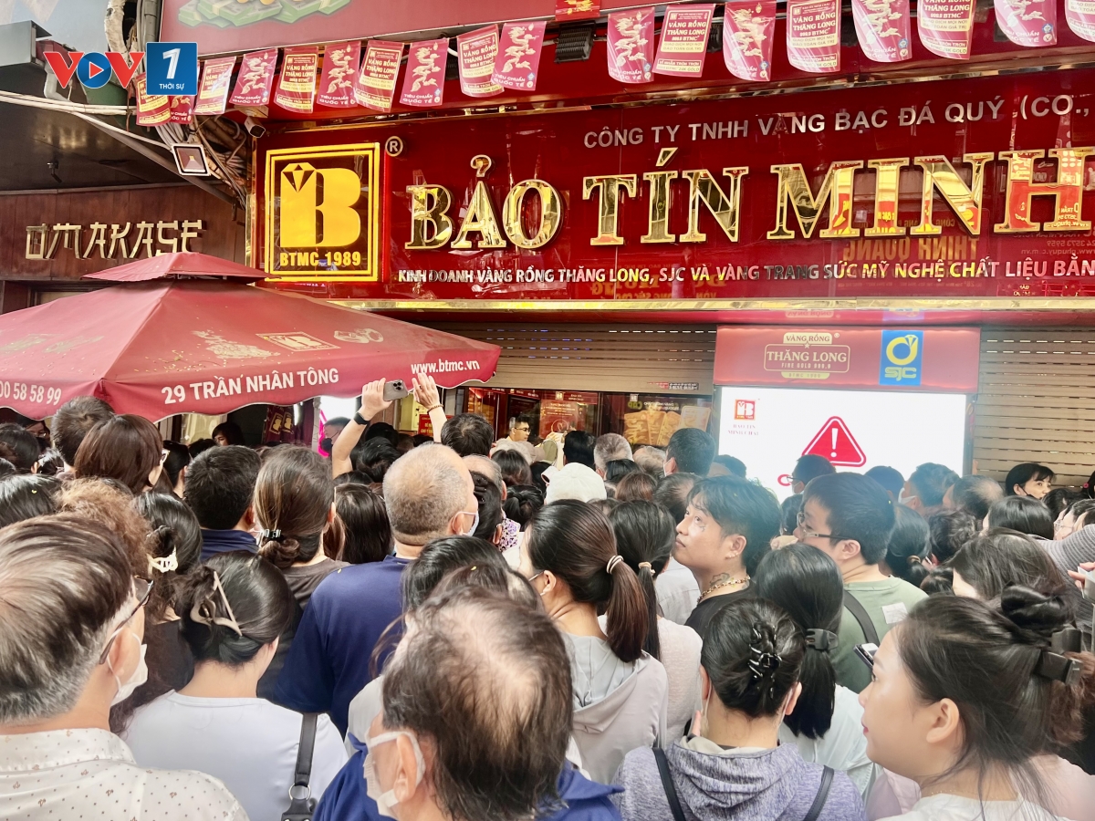 Khảo sát nhanh tại tuyến phố chuyên kinh doanh vàng như Trần Nhân Tông hay Cầu Giấy, Hà Nội hàng dài người đứng chờ mua vàng. Tuy nhiên, điều khiến nhiều người bất ngờ là dù bảng điện tử vẫn niêm yết giá nhưng khi khách đến mua, các cửa hàng đều thông báo “hết hàng” hoặc “chưa có vàng để bán”.