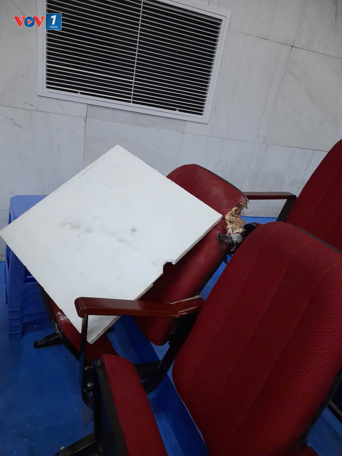 Thế nhưng, trái với số tiền đầu tư sửa chữa và kỳ vọng về một diện mạo mới, thực tế bên trong Hội trường khiến bất cứ ai nhìn vào cũng phải chạnh lòng. Nhiều viên đá ốp tường có dấu hiệu kênh, bong, khô lớp keo. Và đã có vụ đá ốp rơi xuống hàng ghế Hội trường. Ông Hoàng Văn Tập, nhân viên phụ trách cơ sở vật chất nhà trường cho biết: “Đầu giờ chiều 18/09 tôi mở cửa cho cô lao công dọn thì cô báo có viên đá rơi. Tôi kiểm tra thì thấy viên đá 60x60cm, nặng hơn 20 kg, rơi từ hàng thứ 3 tính từ trên trần xuống, cắm sâu vào ghế kim loại. Viên đá chỉ được móc treo, không dán trực tiếp vào tường. Lâu ngày, mạch dán co ngót, khô và bong.”