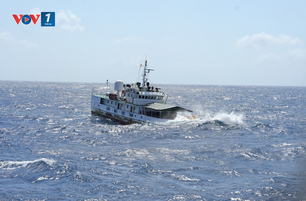 Trong điều kiện thời tiết khắc nghiệt, biển động, sóng lớn, đoàn công tác vẫn tiếp cận từng con tàu đang trực trên ngư trường để thăm hỏi, chúc Tết và nắm tình hình thực hiện nhiệm vụ.