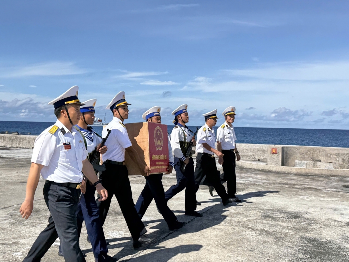 Sau hành trình hơn 300 hải lý, vượt sóng gió trùng khơi, đoàn công tác của Lữ đoàn 146 Vùng 4 Hải quân đã đến đảo Song Tử Tây. Tại đây, hòm phiếu, phiếu bầu và toàn bộ cơ sở vật chất phục vụ bầu cử được bàn giao trang trọng, niêm yết công khai tại trụ sở đảo. Từ cổng chào, trục đường chính đến khu dân cư trên đảo Song Tử Tây, sắc đỏ của cờ Tổ quốc hòa cùng màu quân phục của người lính biển tạo nên bức tranh rực rỡ, trang nghiêm. Các khẩu hiệu tuyên truyền về Luật Bầu cử, quyền và nghĩa vụ của cử tri được treo ở vị trí trang trọng, dễ quan sát, thể hiện rõ quyết tâm tổ chức thành công cuộc bầu cử nơi tuyến đầu Tổ quốc.