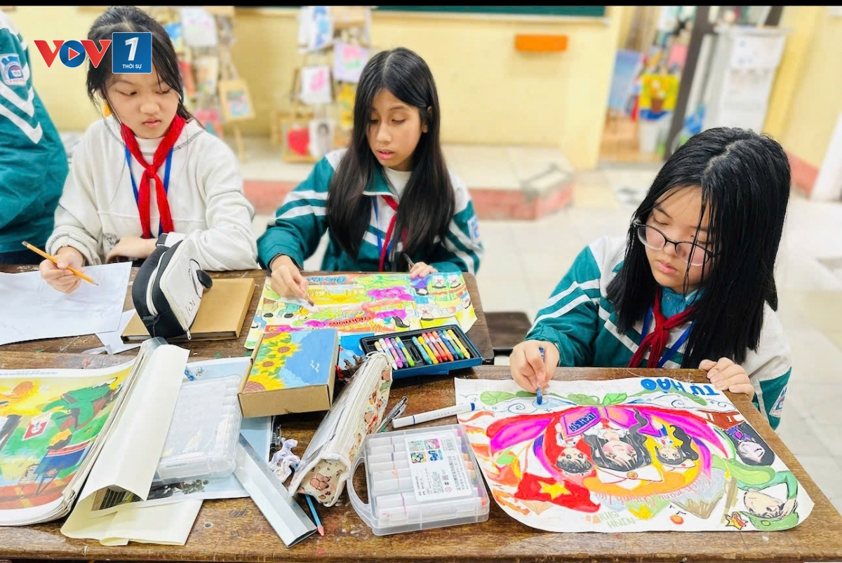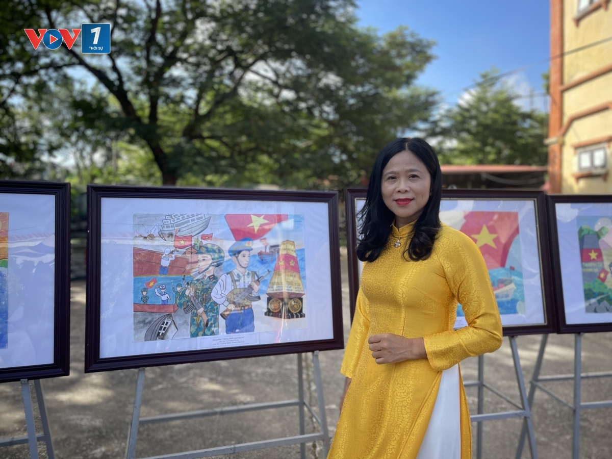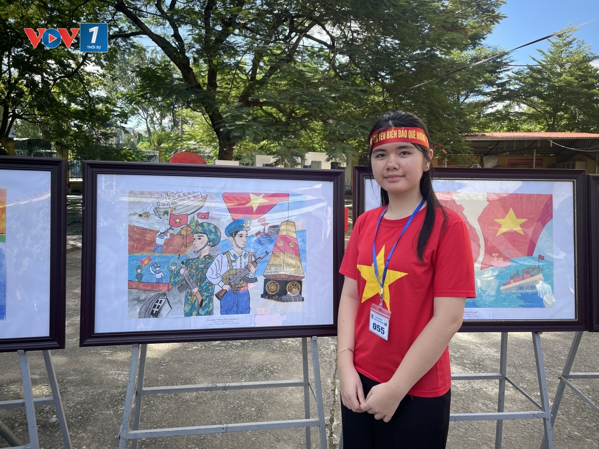 Trong phần thi vẽ tranh, em Tạ Hương Giang, lớp 8E Trường THCS Trương Hán Siêu, để lại ấn tượng đặc biệt với bức tranh “Những người lính nơi đảo xa”. Hương Giang xúc động thuyết minh: "Ở vị trí trung tâm, em vẽ nổi bât hình ảnh những người chiến sĩ Cảnh sát biển và các chú cảnh sát biển chắc tay súng vững vàng, hiên ngang trong bão tố, bên cạnh là lá cờ đỏ sao vàng rực rỡ – biểu tượng thiêng liêng của Tổ quốc. Lá cờ ấy như một lời khẳng định mạnh mẽ chủ quyền biển đảo bất khả xâm phạm của Việt Nam.”Xung quanh bức tranh là khung cảnh biển trời mênh mông, những con tàu căng buồm ra khơi, hình ảnh ngư dân ngày đêm bám biển. Hương Giang gửi gắm thông điệp giản dị mà sâu sắc: “Mỗi chúng ta hãy biết yêu quý, giữ gìn và bảo vệ để biển đảo Việt Nam mãi xanh tươi, để lá cờ đỏ sao vàng luôn tung bay kiêu hãnh trên bầu trời Tổ quốc.”