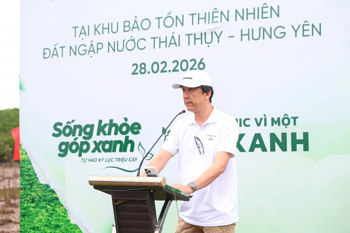 # Ngay từ sáng sớm, tại Khu bảo tồn thiên nhiên đất ngập nước Thái Thụy, các đại biểu đại diện các bộ, ngành Trung ương, lãnh đạo địa phương, tổ chức quốc tế, doanh nghiệp và đông đảo người dân địa phương đã trực tiếp trồng 9 nghìn cây bần chua do công ty TNHH Panasonic Việt Nam trao tặng. Đây là loại cây có đặc tính chịu mặn và bộ rễ khỏe, đóng vai trò then chốt trong việc củng cố hệ sinh thái đất ngập nước, chống xói mòn và tối ưu khả năng hấp thụ các-bon.