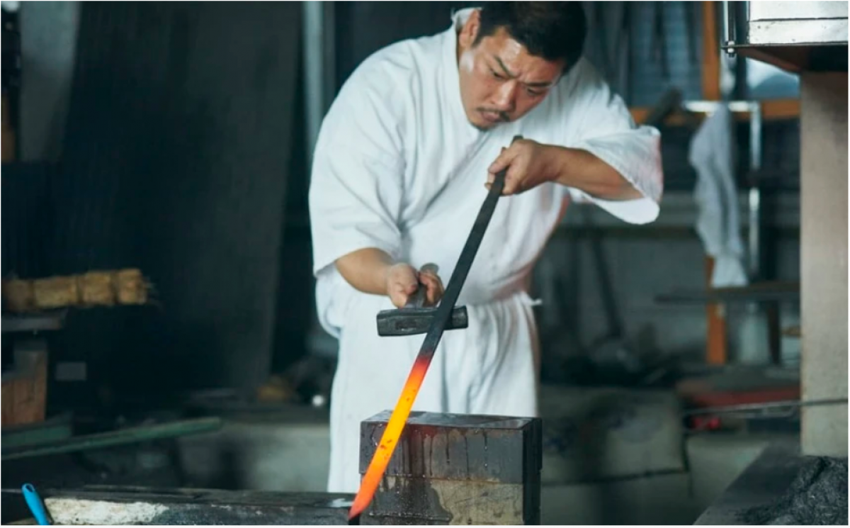 Trong khuôn khổ nghi lễ, 7 nghệ nhân đã nung thép ở nhiệt độ trên 1.000 độ C, sau đó dùng búa liên tục rèn và đập kim loại nhằm loại bỏ tạp chất. Những động tác mạnh mẽ, dứt khoát cùng tia lửa bắn tung tóe đã tái hiện kỹ thuật rèn kiếm truyền thống được gìn giữ qua nhiều thế hệ.