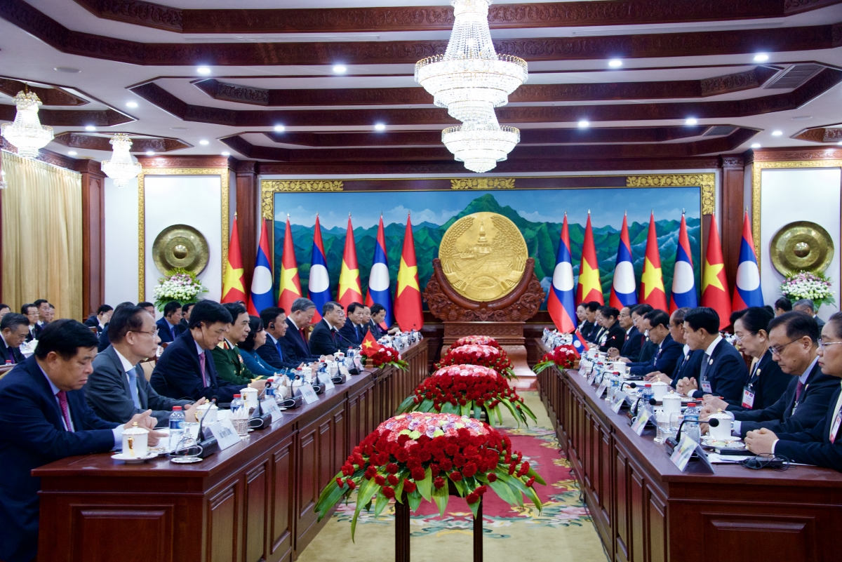 Sáng 01/12, sau lễ đón chính thức trọng thể Tổng Bí thư Tô Lâm và Phu nhân cùng Đoàn đại biểu cấp cao Đảng, Nhà nước Việt tại Phủ Chủ tịch theo nghi thức cao nhất dành cho nguyên thủ quốc gia, Tổng Bí thư Tô Lâm đã hội đàm với Tổng Bí thư, Chủ tịch nước Lào Thongloun Sisoulith.
