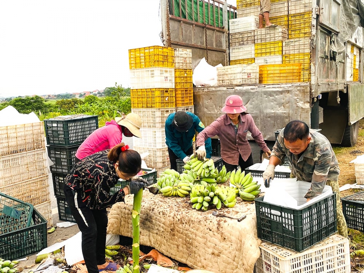 Ông Phúc cho biết, trước khi trồng chuối, ông đã mất nhiều năm canh tác các loại cây lấy củ, vất vả nhưng không hiệu quả. Được sự hỗ trợ của các cấp hội, ông đã mạnh dạn vay vốn từ Ngân hàng Chính sách xã hội và chuyển sang trồng chuối tiêu hồng mang lại hiệu quả gấp nhiều lần. Quả để bán, thân và lá tận dụng cho chăn nuôi. Cùng với trồng chuối, ông thả cá, chăn nuôi gà, lợn. Mỗi năm trừ chi phí thu về lợi nhuận từ 500-700 triệu đồng.