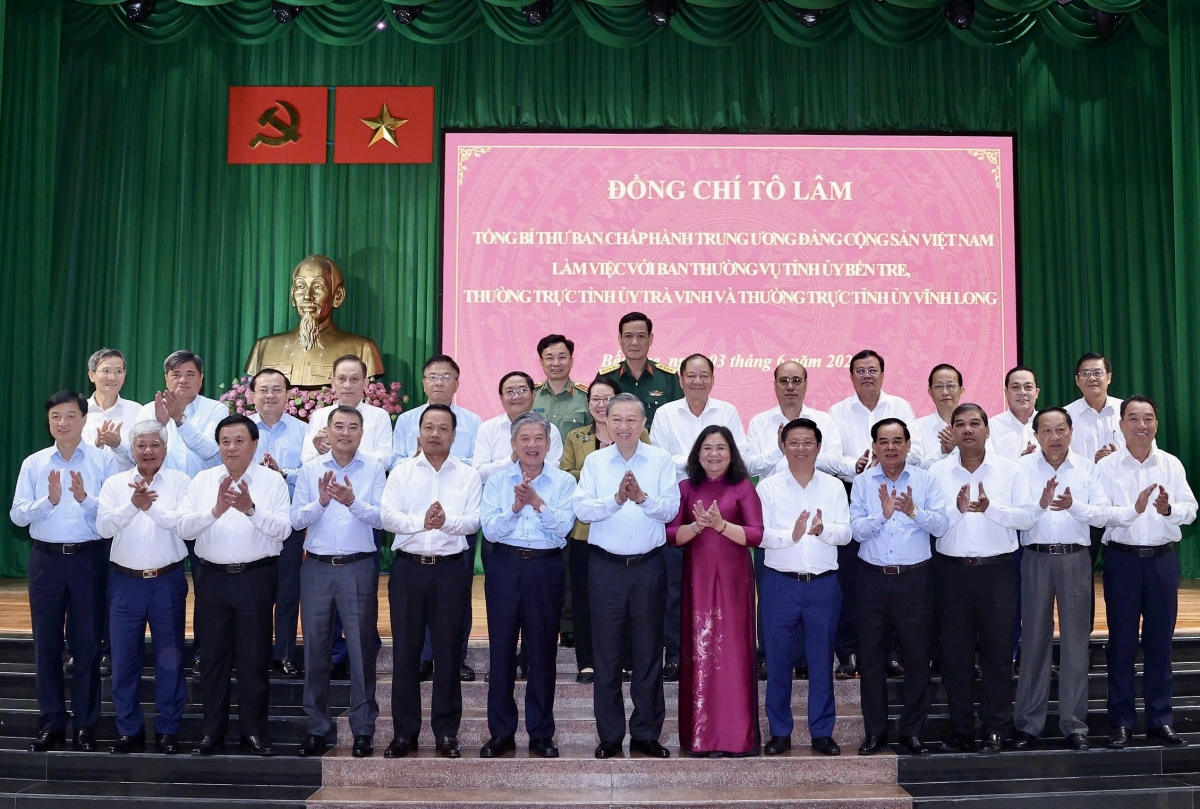 Một lần nữa nêu rõ quan điểm, việc sáp nhập, hợp nhất ba tỉnh Vĩnh Long, Bến Tre và Trà Vinh là quyết định có tính chiến lược đã được đánh giá, cân nhắc kỹ lưỡng trên hành trình hiện thực hóa các Nghị quyết lớn của Bộ Chính trị về phát triển vùng ĐBSCL, phát triển kinh tế tư nhân, khoa học - công nghệ, chuyển đổi số, đổi mới tổ chức chính quyền và nâng cao năng lực thực thi chính sách ở cấp địa phương, Tổng Bí thư bày tỏ mong muốn và đề nghị, tỉnh mới sau sáp nhập phải chủ động chuyển mình từ tư duy nhiệm kỳ sang tư duy chiến lược dài hạn, phải có tầm nhìn và sự kiên định, nhất quán; từ quản lý hành chính sang kiến tạo phát triển; từ hành động đơn lẻ sang phối hợp tổng thể giữa cấp ủy, chính quyền, doanh nghiệp và người dân.