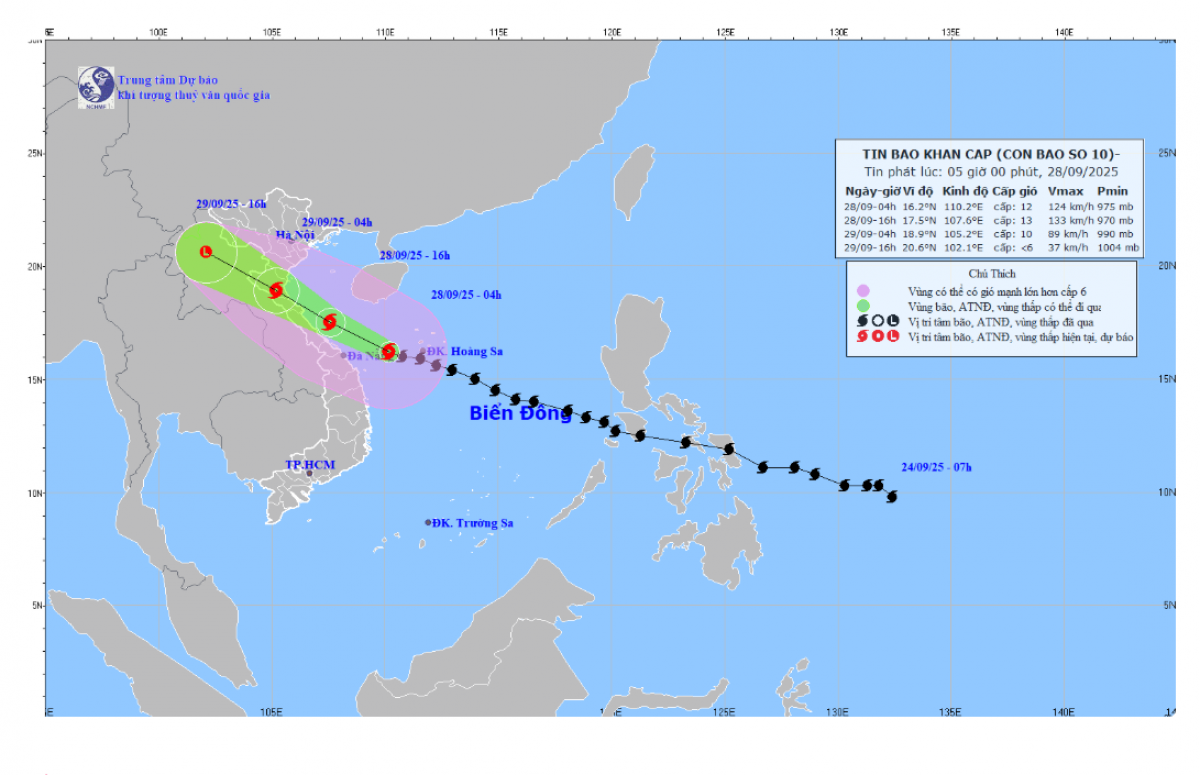 Trung tâm Dự báo Khí tượng Thuỷ văn Quốc gia cho biết, 4 giờ ngày 28/9, vị trí tâm bão ở vào khoảng 16,2 độ Vĩ Bắc; 110,2 độ Kinh Đông, trên vùng biển phía Tây đặc khu Hoàng Sa, cách Tp. Đà Nẵng khoảng 200km về phía Đông. Sức gió mạnh nhất vùng gần tâm bão mạnh cấp 12 (118-133km/giờ), giật cấp 15. Di chuyển theo hướng Tây Tây Bắc với tốc độ 30km/h.