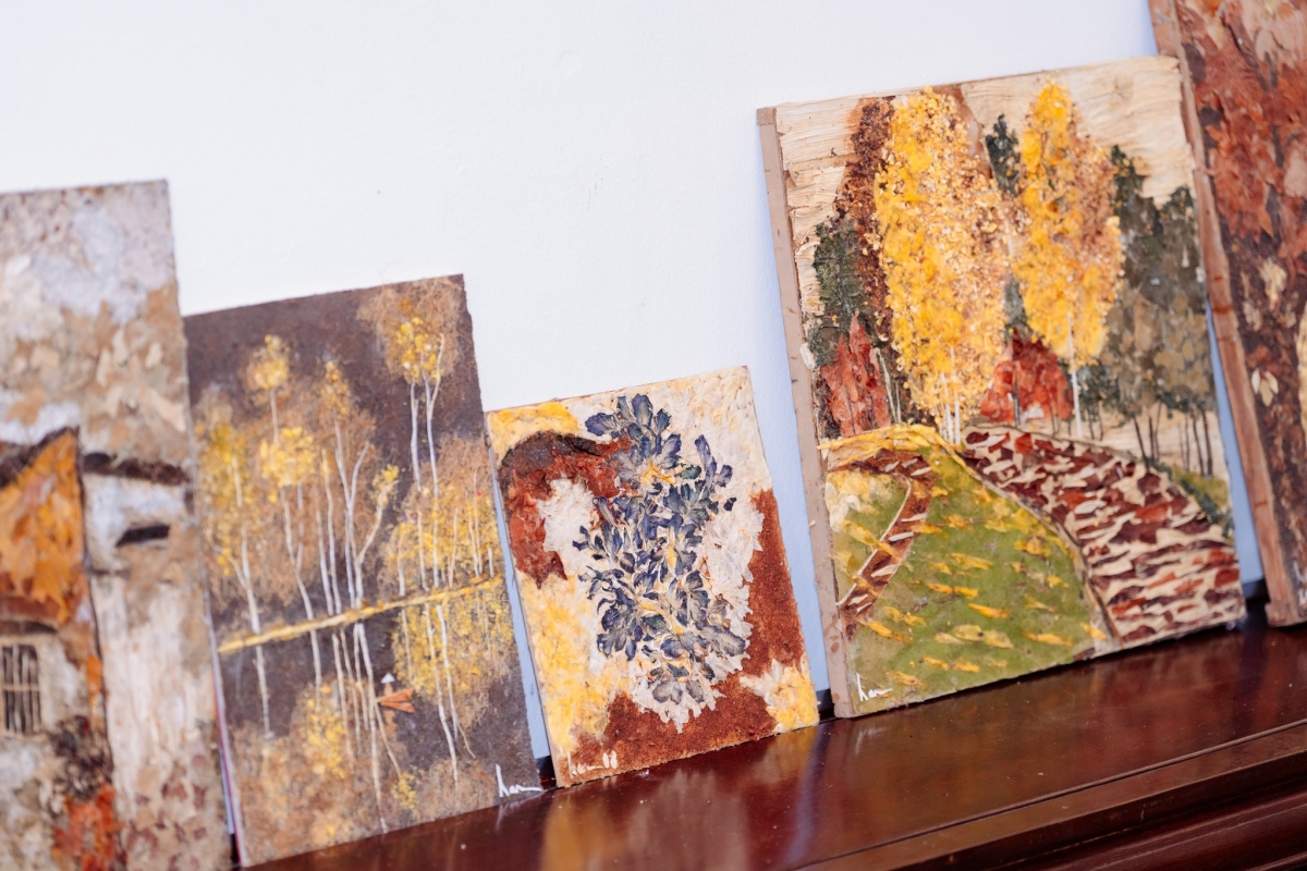 Với hoạ sĩ Tạ Hải, mỗi cánh hoa khô không phải là dấu chấm hết cho một kiếp hoa, mà là bắt đầu của một câu chuyện khác. Vỏ hành tỏi không còn là rác thải nhà bếp mà trở thành những vân màu tự nhiên, những lớp màng mỏng tang tạo nên chiều sâu cho bức vẽ. Ông không dùng màu vẽ hóa học để lấp liếm đi vẻ ngoài của chúng, ông tôn trọng từng vết ố, từng đường gân của lá cây. Đó chính là sự tôn trọng đối với quy luật của tự nhiên. Sự tỉ mỉ đến cực đoan của người nghệ sĩ trong việc lựa chọn từng mảnh vỏ trứng, ép từng cánh hoa đã chứng minh một điều: Cái đẹp không nằm ở giá trị vật chất của nguyên liệu, mà nằm ở tâm thế của người tạo tác.