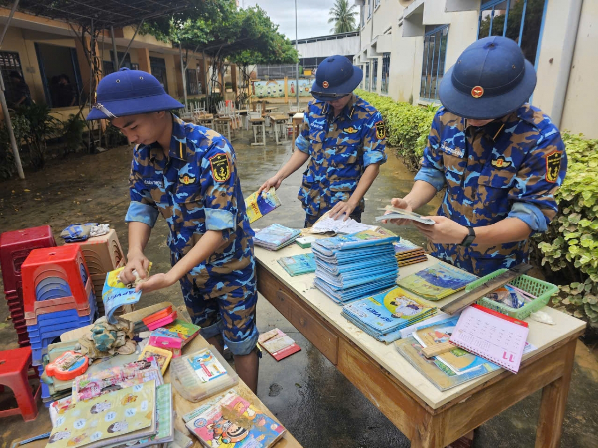 Tại các điểm ngập nặng, cán bộ học viên Học viện Hải quân tổ chức tổng dọn nhà dân, đường giao thông, thu gom rác thải, bùn đất do lũ cuốn về. Đặc biệt, các tổ công tác tập trung lực lượng hỗ trợ vệ sinh, sắp xếp lại cơ sở vật chất tại các trường học, giúp phân loại sách vở, dụng cụ học tập còn sử dụng được để học sinh sớm trở lại lớp.