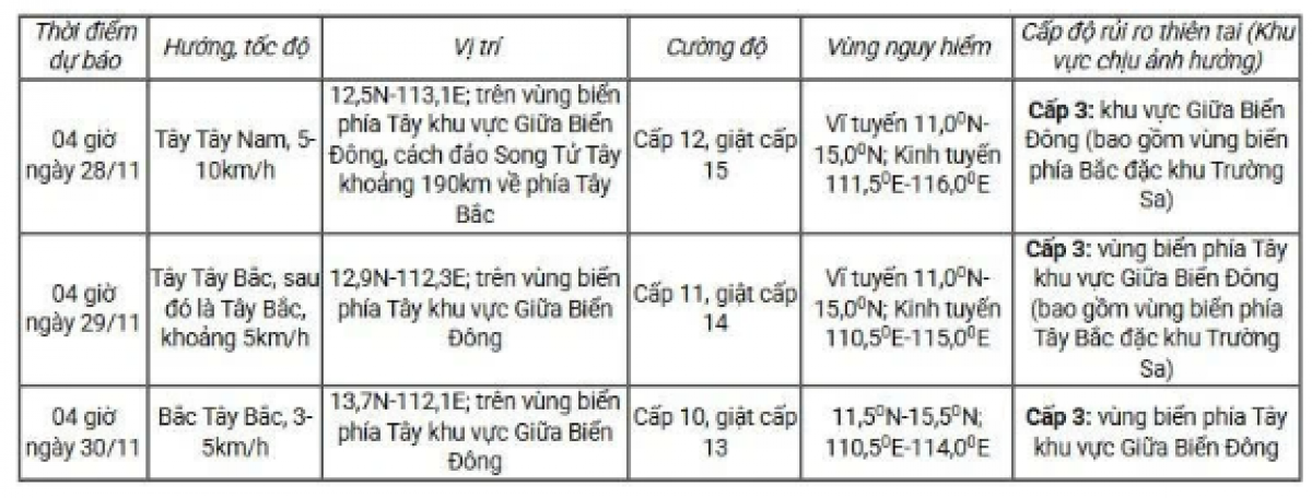 Hồi 4h ngày 27/11, vị trí tâm bão ở vào khoảng 13,0 độ Vĩ Bắc; 114,5 độ Kinh Đông, cách đảo Song Tử Tây khoảng 190km về phía Bắc. Sức gió mạnh nhất vùng gần tâm bão mạnh cấp 12 (118-133km/h), giật cấp 15. Di chuyển theo hướng Tây Tây Bắc, tốc độ khoảng 15km/h.