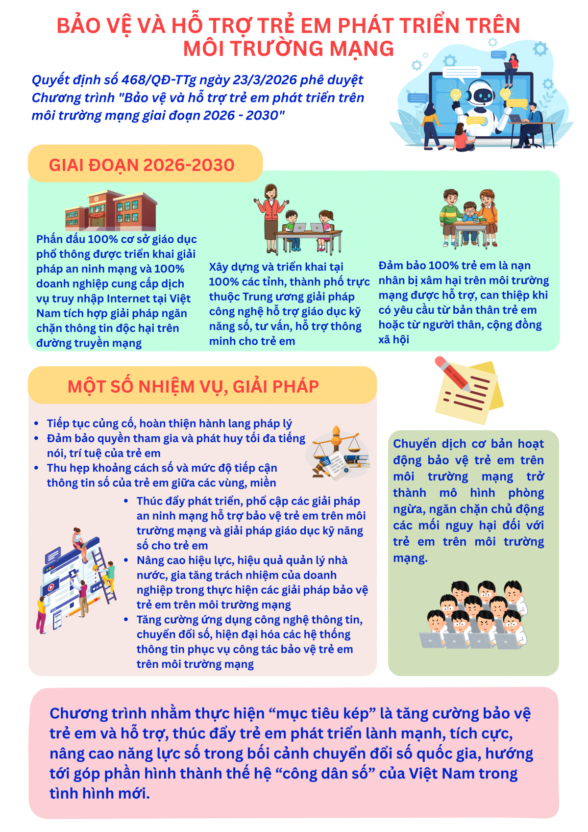 VOV1 - Thủ tướng Chính phủ vừa ký Quyết định số 468/QĐ-TTg ngày 23/3/2026 phê duyệt Chương trình "Bảo vệ và hỗ trợ trẻ em phát triển trên môi trường mạng giai đoạn 2026 - 2030".