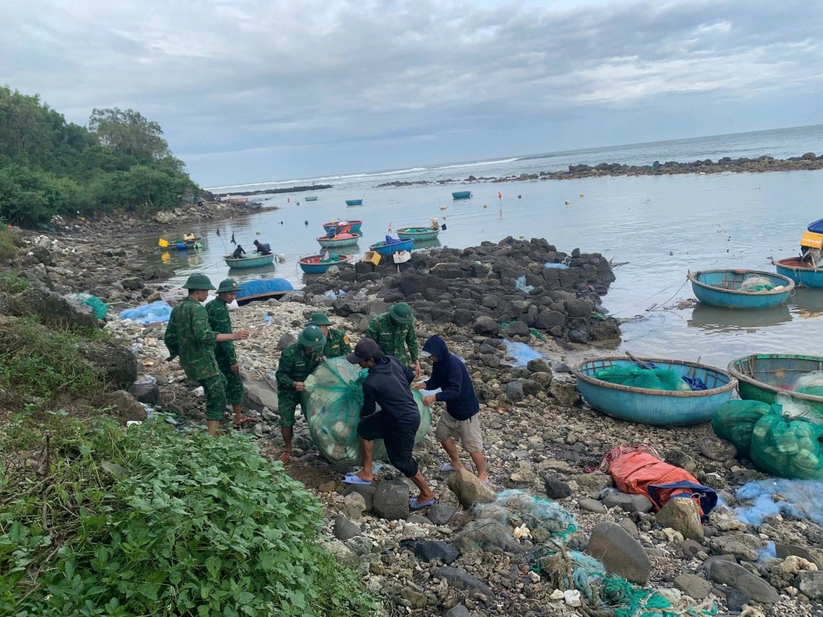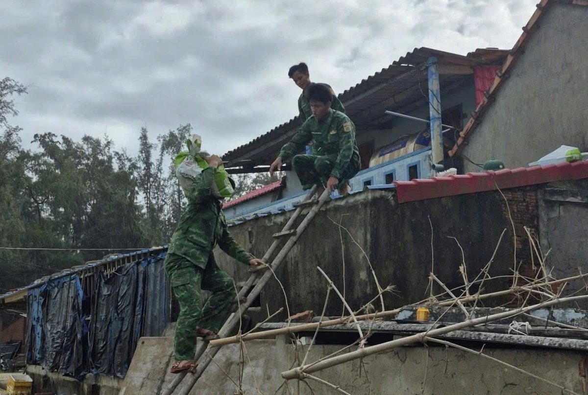 Ở khu vực xã Vạn Tường, cán bộ, chiến sĩ Đồn Biên phòng Bình Hải có mặt tại bãi ngang An Cường, cùng người dân thôn Phước Thiện di chuyển thúng, phương tiện đánh bắt lên bờ, cất giữ ngư lưới cụ tránh thiệt hại. Mưa gió đã dày, nhưng từng nhóm bộ đội vẫn miệt mài bên bà con, kẻ kéo, người đẩy, chan hòa nghĩa tình quân – dân vùng biển.