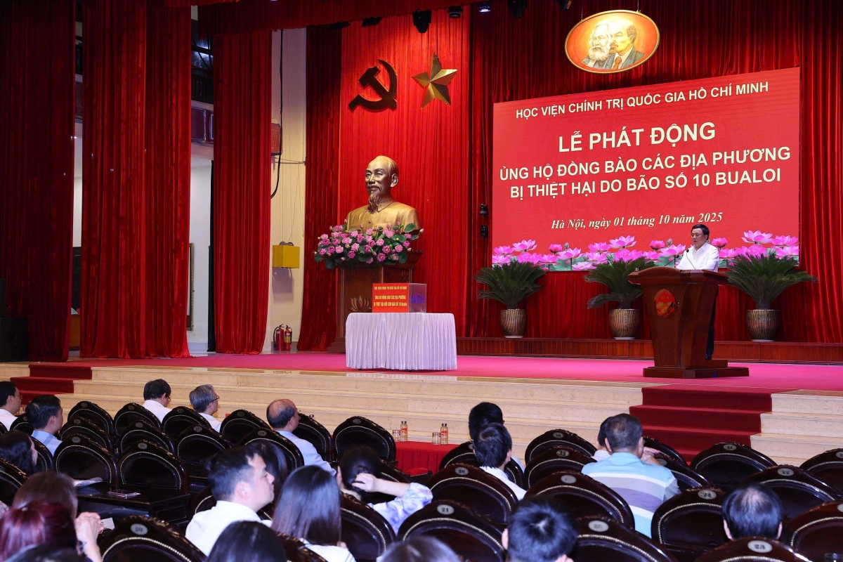 Phát biểu tại Lễ phát động ủng hộ đồng bào các địa phương bị thiệt hại do cơn bão số 10 gây ra, Giáo sư, Tiến sĩ Nguyễn Xuân Thắng, Ủy viên Bộ Chính trị, Giám đốc Học viện, Chủ tịch Hội đồng lý luận Trung ương nhấn mạnh: Phát huy truyền thống đoàn kết, tinh thần “tương thân tương ái, lá lành đùm lá rách” của dân tộc, Học viện Chính trị quốc gia Hồ Chí Minh tổ chức Lễ phát động quyên góp, kịp thời chia sẻ khó khăn với bà con vùng bị ảnh hưởng.