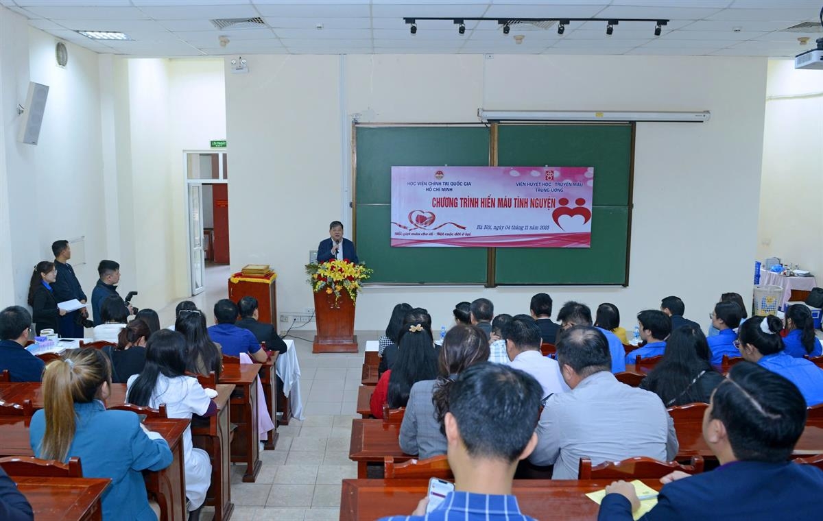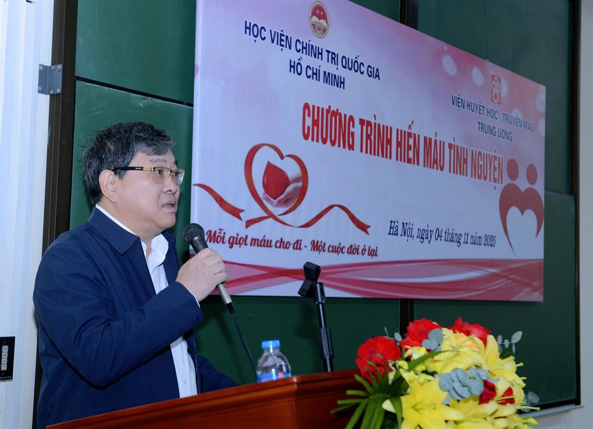 Phát biểu tại “Chương trình Hiến máu tình nguyện năm 2025”, PGS.TS Nguyễn Duy Bắc, Phó Giám đốc Học viện Chính trị quốc gia Hồ Chí Minh cho biết: Trong nhiều năm qua, hiến máu tình nguyện đã trở thành một hoạt động truyền thống, mang đậm ý nghĩa nhân văn của cán bộ, công chức, viên chức, người lao động và học viên trong Học viện. Thay mặt Đảng ủy, Ban Giám đốc Học viện, PGS.TS Nguyễn Duy Bắc biểu dương, ghi nhận và đánh giá cao nghĩa cử cao đẹp, giàu lòng nhân ái của các cán bộ, học viên, sinh viên tham gia hiến máu. Đây là hoạt động thể hiện tinh thần trách nhiệm, tình cảm và ý thức cộng đồng sâu sắc – những giá trị nhân văn cao quý luôn được Học viện Chính trị quốc gia Hồ Chí Minh gìn giữ và phát huy.