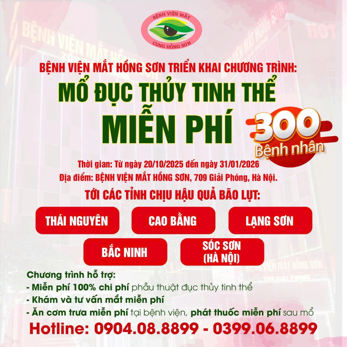 Từ ngày 20/10/2025 đến hết 31/01/2026, người dân các địa phương bị ảnh hưởng bão lũ tại Thái Nguyên, Bắc Ninh, Cao Bằng, Lạng Sơn và một số xã ngoại thành tại Hà Nội sẽ được các bác sỹ BV Mắt Hồng Sơn khám và tư vấn mắt miễn phí; Hỗ trợ 100% chi phí phẫu thuật đục thủy tinh thể; Ăn trưa tại bệnh viện và cấp phát thuốc miễn phí sau mổ.