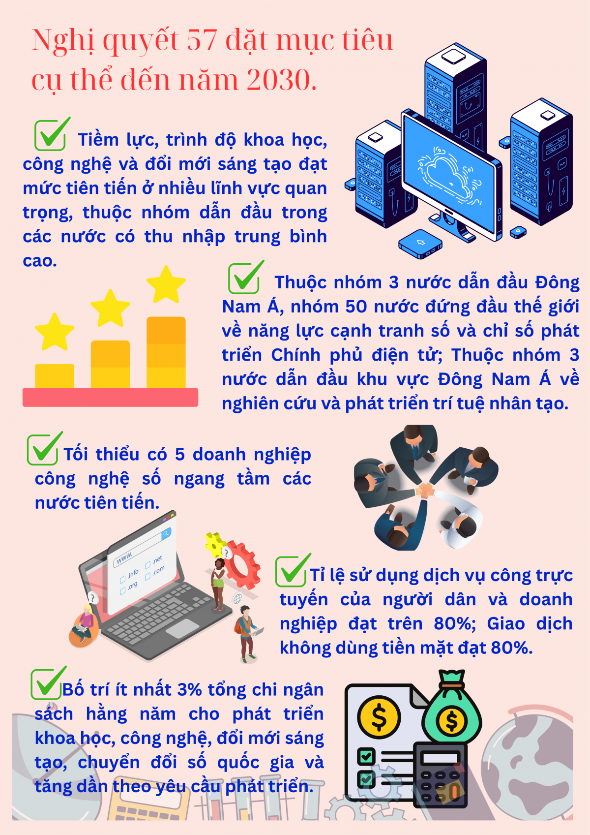 Một số mục tiêu về phát triển khoa học, công nghệ, đổi mới sáng tạo và chuyển đổi số quốc gia đến năm 2030 theo Nghị quyết 57 của Bộ Chính trị.
