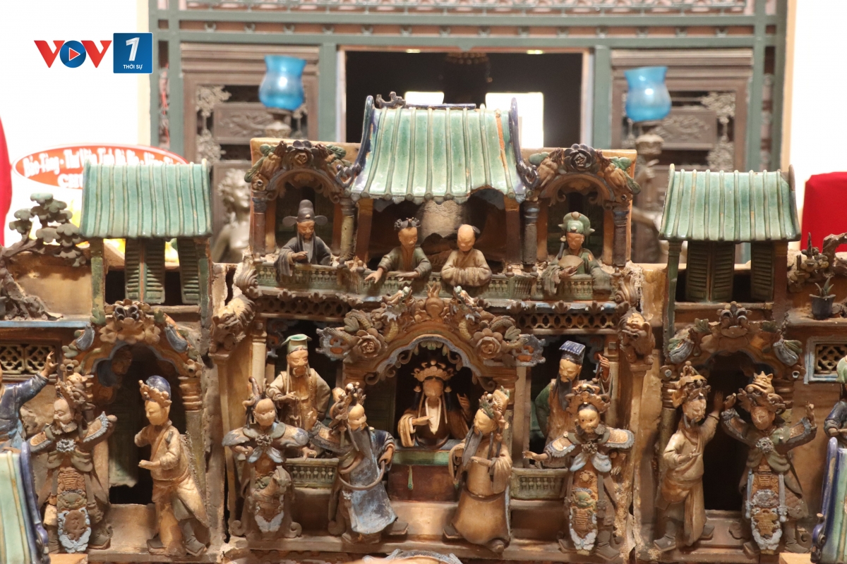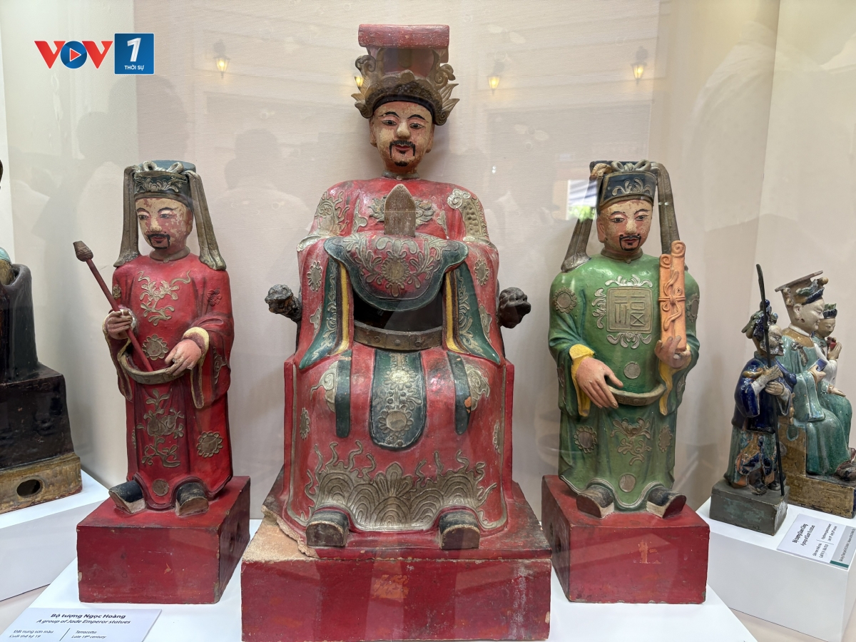 50 hiện vật tiêu biểu được trưng bày, chia thành 4 nhóm chủ đề gồm: tượng thờ Phật giáo như Phật, Bồ Tát, La Hán, Diêm Vương, với tư thế và trang phục tuần thủ nghiêm ngặt quy tắc đồ tượng học Phật giáo; tượng thờ đạo giáo tiêu biểu là bộ Tam Quan Đại Đế; tượng thờ dân gian gồm các pho tượng đặc sắc như Ngọc Hoàng, Phúc Đức Thổ Địa, Quan Thánh Đế Quân, Chúa Tiên Nương Nương... mang dậm phong cách tạo hình dân gian; tượng trang trí kiến trúc bao gồm tượng các nhân vật Đạo giáo và dân gian như Bát Tiên, Ông Nhật - Bà Nguyệt, …cùng các quần thể tiểu tượng thường được gắn trên mái đình, chùa, miếu, hội quán của cả người Việt lẫn người Hoa.